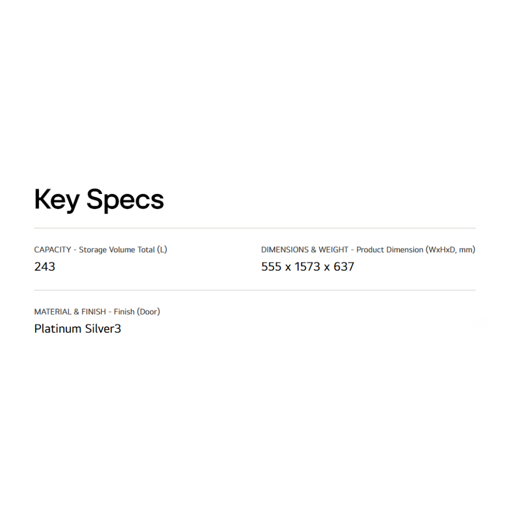 • 263L Gross Capacity. • LinearCooling™ keeps farm-fresh taste. • DoorCooling+™ delivers freshness evenly. • Multi Air Flow. • Smart Inverter Compressor. • Platinum Silver 3 finish. • **Warranty: 1 Year General Warranty, 10 Years Compressor Warranty.**
