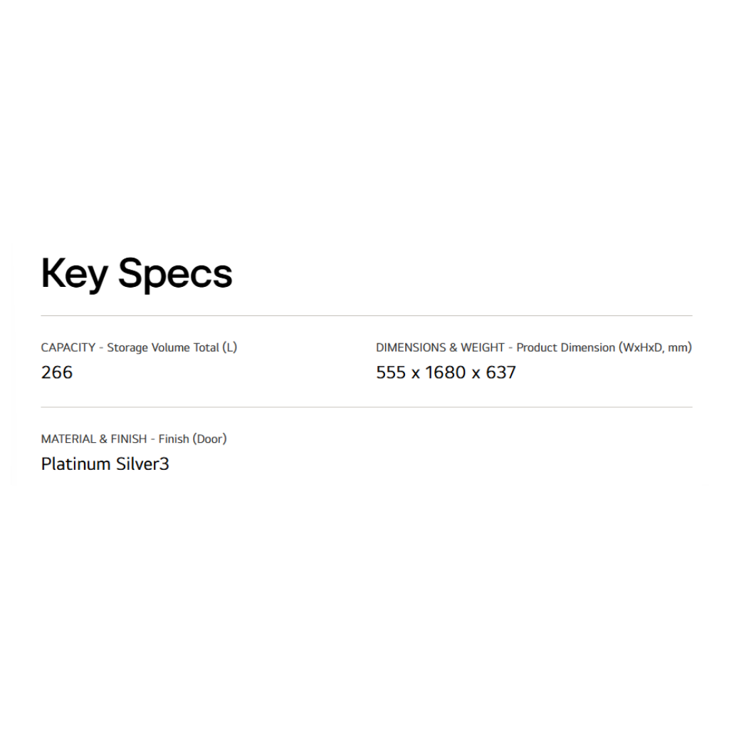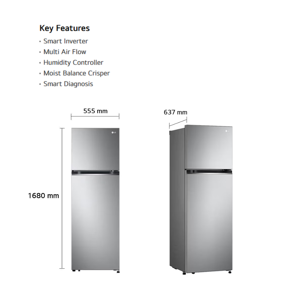 • 287L Gross Capacity. • LinearCooling™ & DoorCooling+™. • Multi Air Flow system. • Pull-out Tray and Moving Ice Maker. • Smart Inverter Compressor. • Platinum Silver 3 finish. • **Warranty: 1 Year General Warranty, 10 Years Compressor Warranty.**