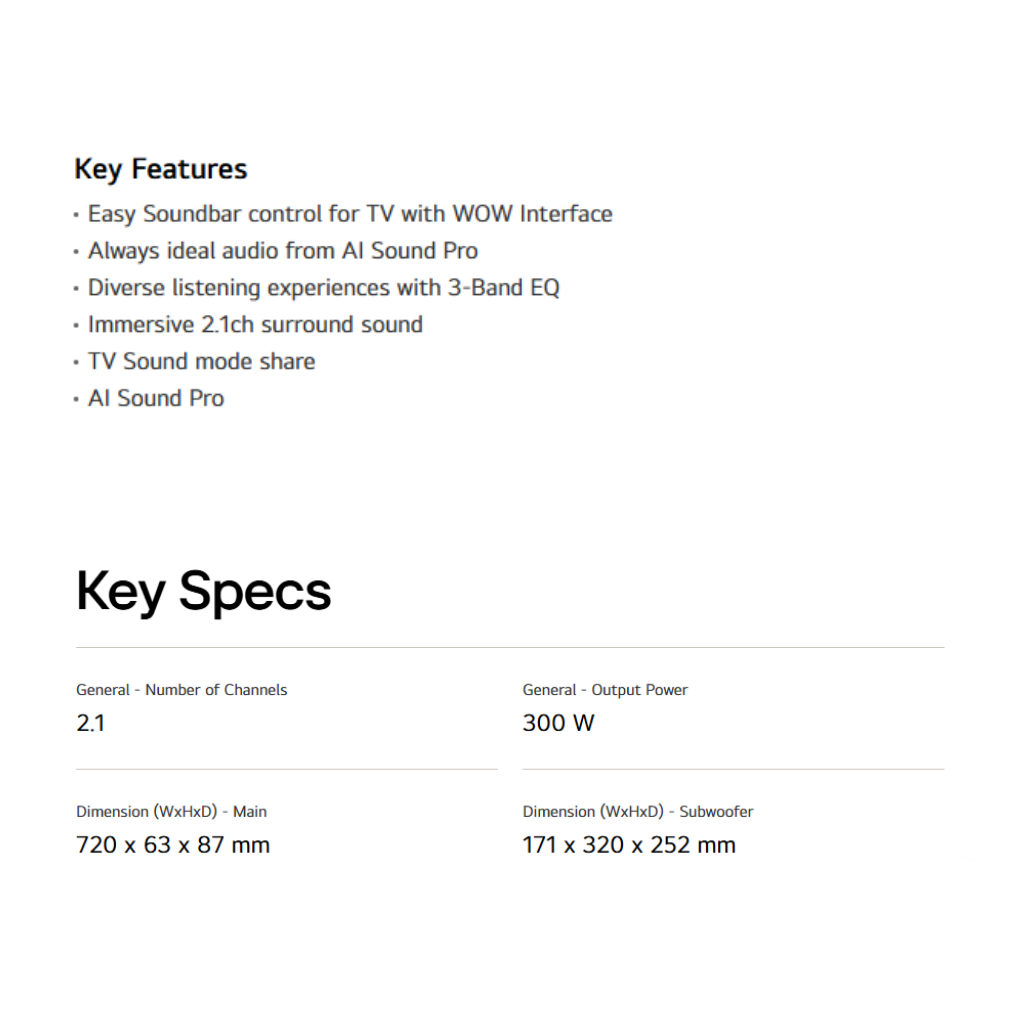 • 300W Total Power 2.1 Channel system. • Wireless Subwoofer with carbon diaphragm for fidelity. • Dolby Digital and DTS Digital Surround. • AI Sound Pro adapts audio to content. • Bluetooth streaming. • **Warranty: 1 Year General Warranty.**