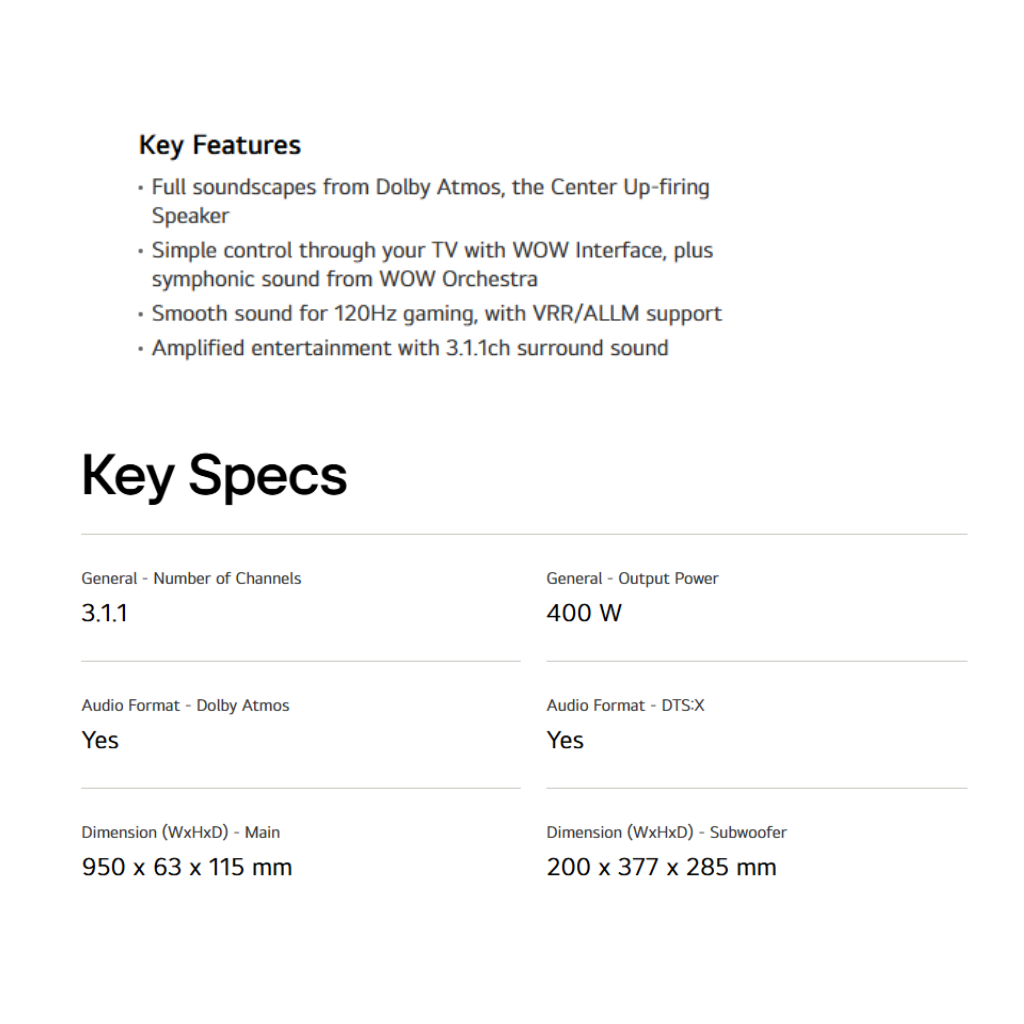 • 400W Power Output. • 3.1.1 Channel with world's first Up-firing center speaker. • Dolby Atmos and DTS:X support. • WOW Orchestra syncs with LG TV speakers. • Spotify Connect & Tidal Connect. • **Warranty: 1 Year General Warranty.**