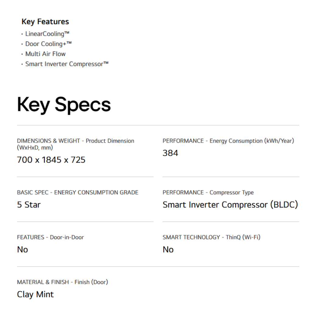 • 493L Gross Capacity. • LinearCooling™ and DoorCooling+™. • Hygiene Fresh+™ 5-step air filtration. • Fresh 0 Zone saves time on defrosting. • Unique Clay Mint finish. • ThinQ™ Wi-Fi control. • **Warranty: 1 Year General Warranty, 10 Years Compressor Warranty.**