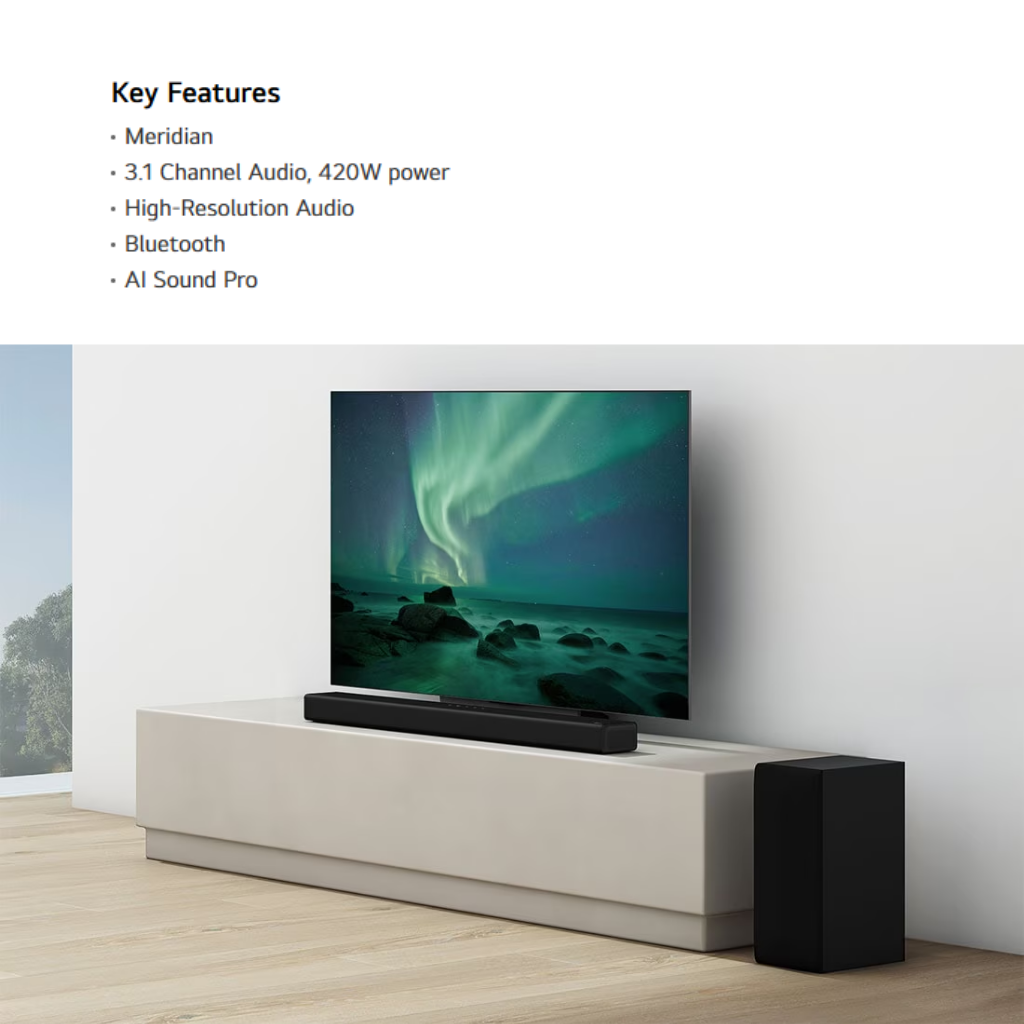• 420W Output Power. • 3.1 Channel with High Resolution Audio (96kHz/24bit). • Meridian Audio partnership. • DTS Virtual:X and Dolby Digital. • HDMI ARC support. • **Warranty: 1 Year General Warranty.**