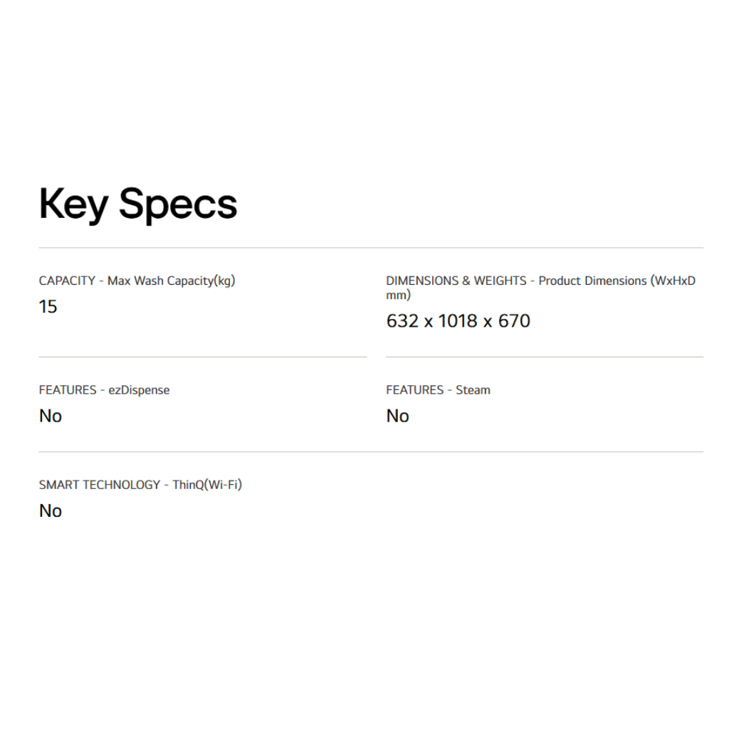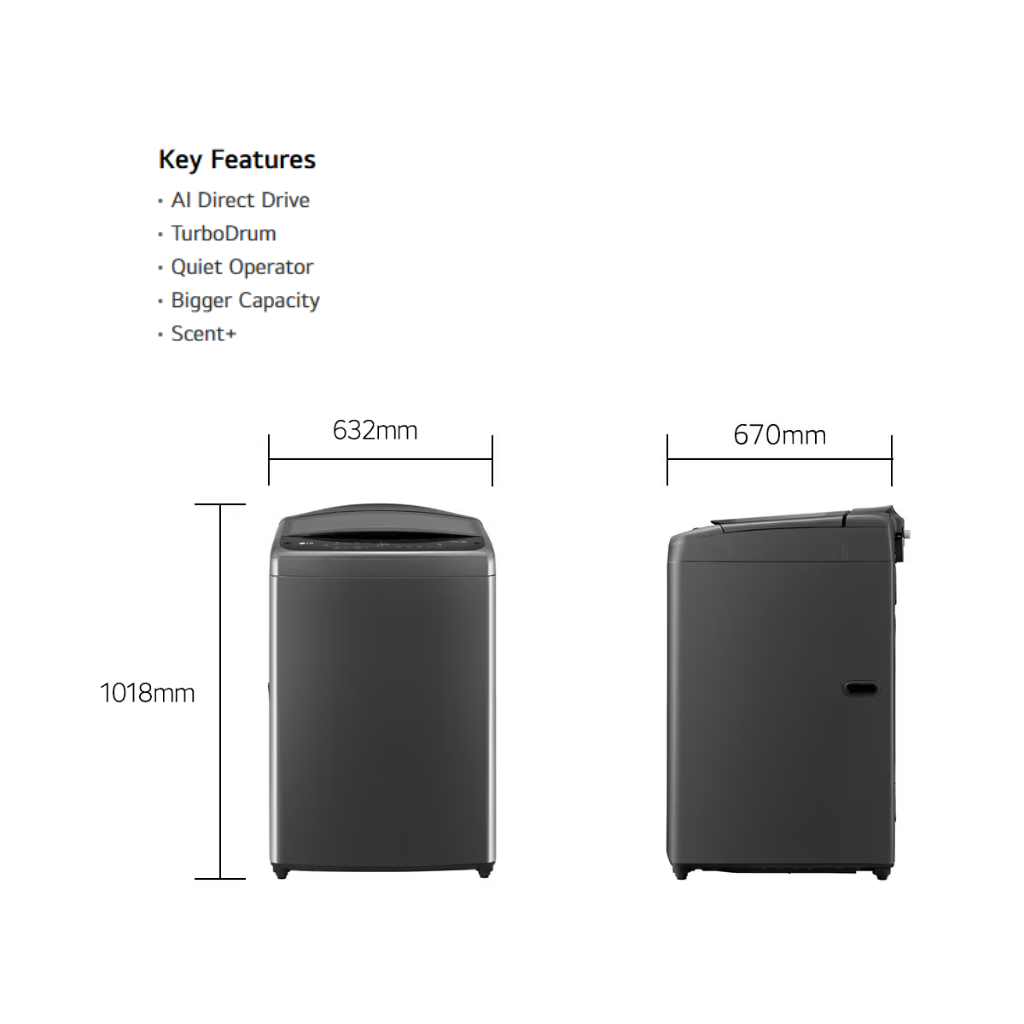 • 15kg Capacity. • AI Direct Drive™ for intelligent fabric care. • Inverter Direct Drive Motor. • 6 Motion DD technology. • ThinQ™ for smart diagnostics and control. • Full Stainless Steel Tub. • **Warranty: 1 Year General Warranty, 10 Years Motor Warranty.**