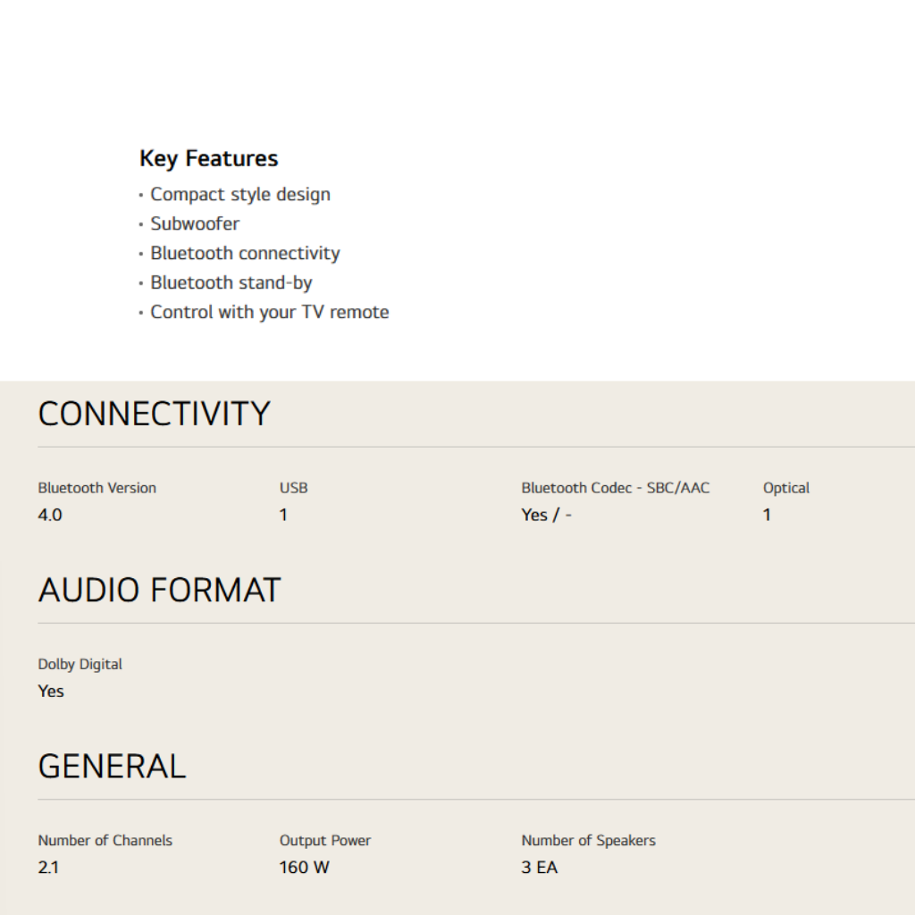 • 160W Total Power. • 2.1 Channel with Wireless Subwoofer. • Dolby Digital support. • Bluetooth and Optical Input. • Compact, minimalist design. • **Warranty: 1 Year General Warranty.**