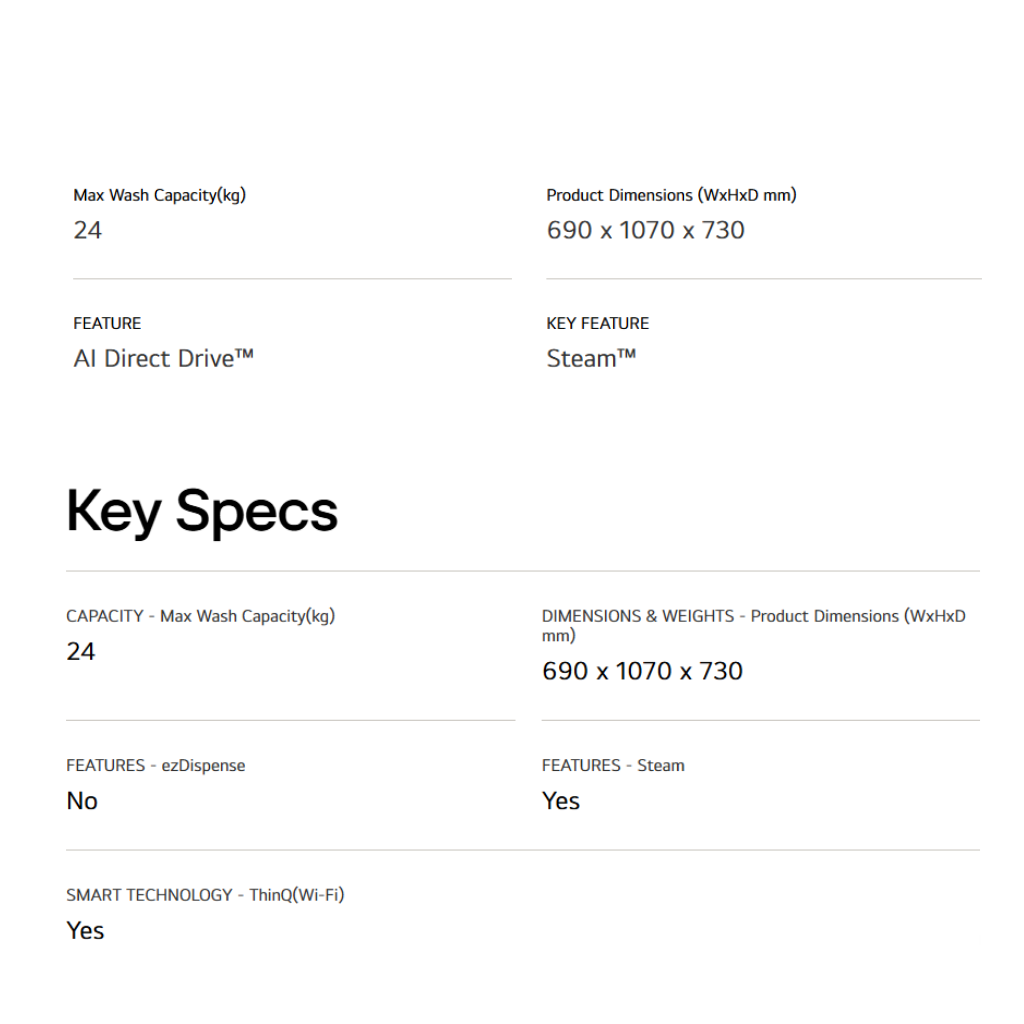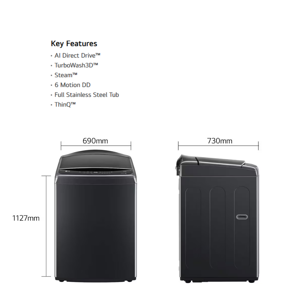 • 24kg Ultra Large Capacity. • AI Direct Drive™ intelligent washing. • TurboWash™ with 3D Waterfall. • Steam™ function. • ThinQ™ connectivity. • Full Stainless Steel Tub. • **Warranty: 1 Year General Warranty, 10 Years Motor Warranty.**