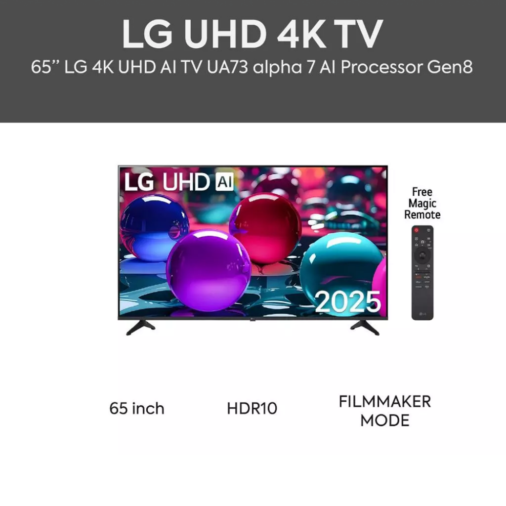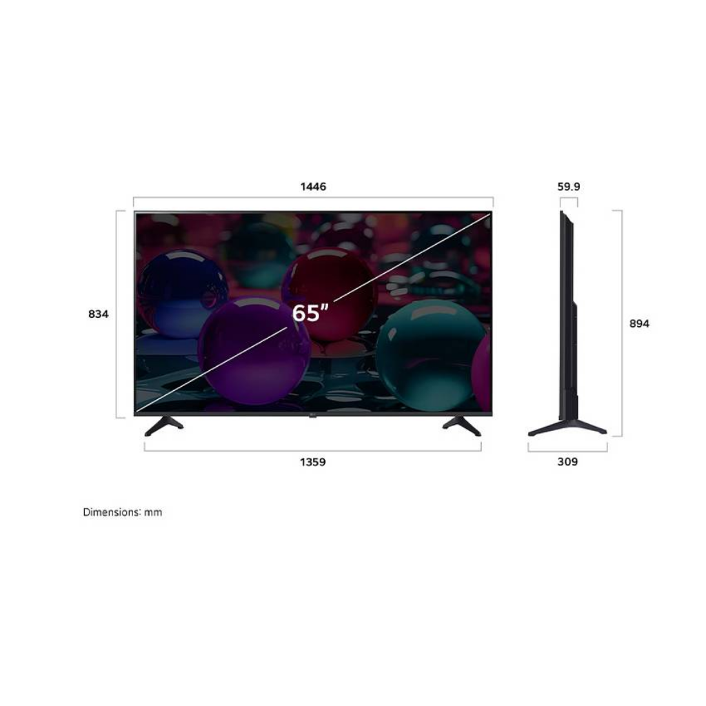 • 65-inch Real 4K UHD screen. • alpha 5 AI Processor 4K Gen7 enhances picture and sound. • AI Sound Pro (Virtual 9.1.2 Up-mix). • webOS Re:New Program guarantees upgrades for 5 years. • Apple AirPlay2 and HomeKit compatible. • Magic Remote Ready. • **Warranty: 2 Years General Warranty.**