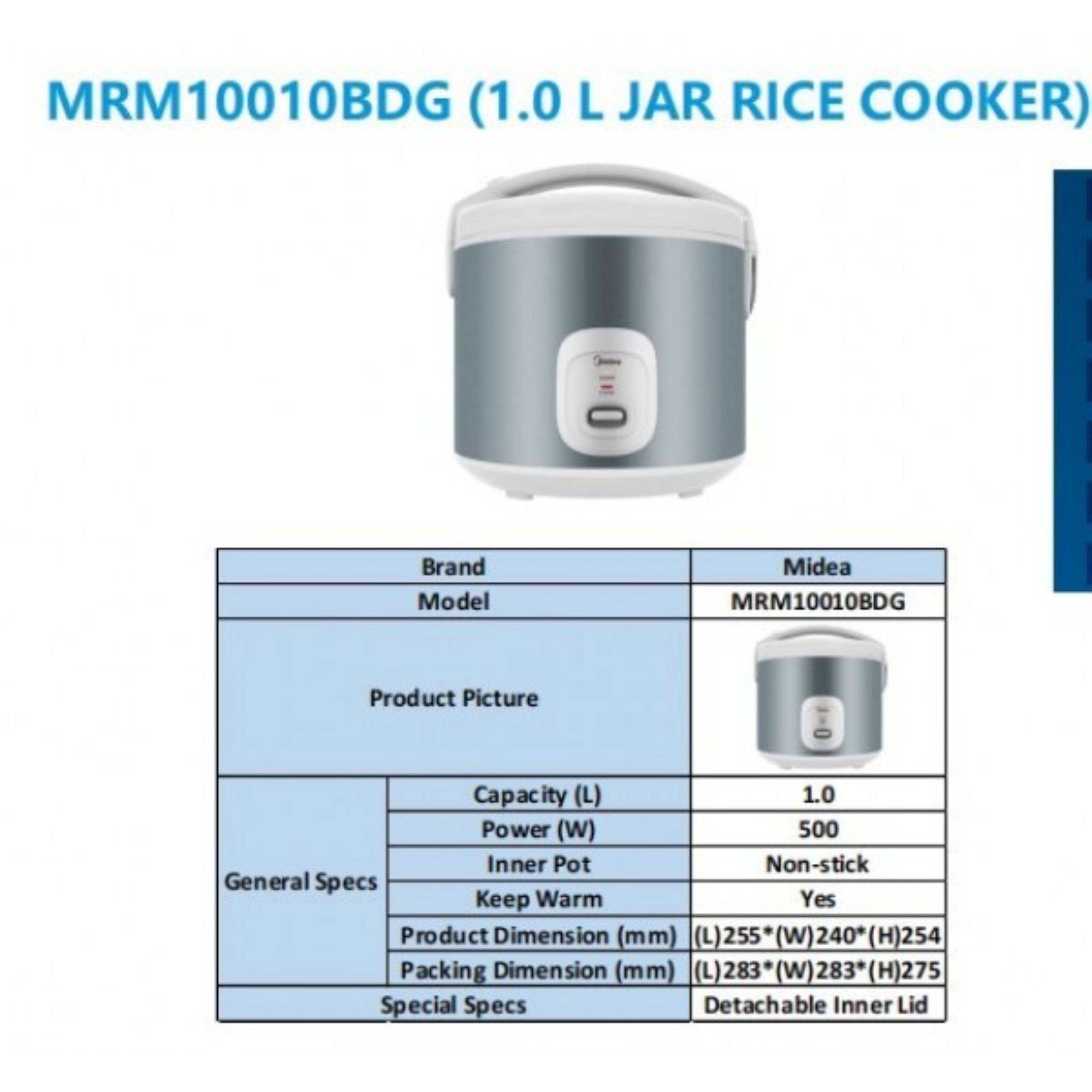 Midea 1.0L Jar Rice Cooker MRM10010BDG Features: - Capacity: 1.0L - One Touch Operation - Keep Warm Function - Non-Stick Inner Pot Warranty: 1 Year General Warranty