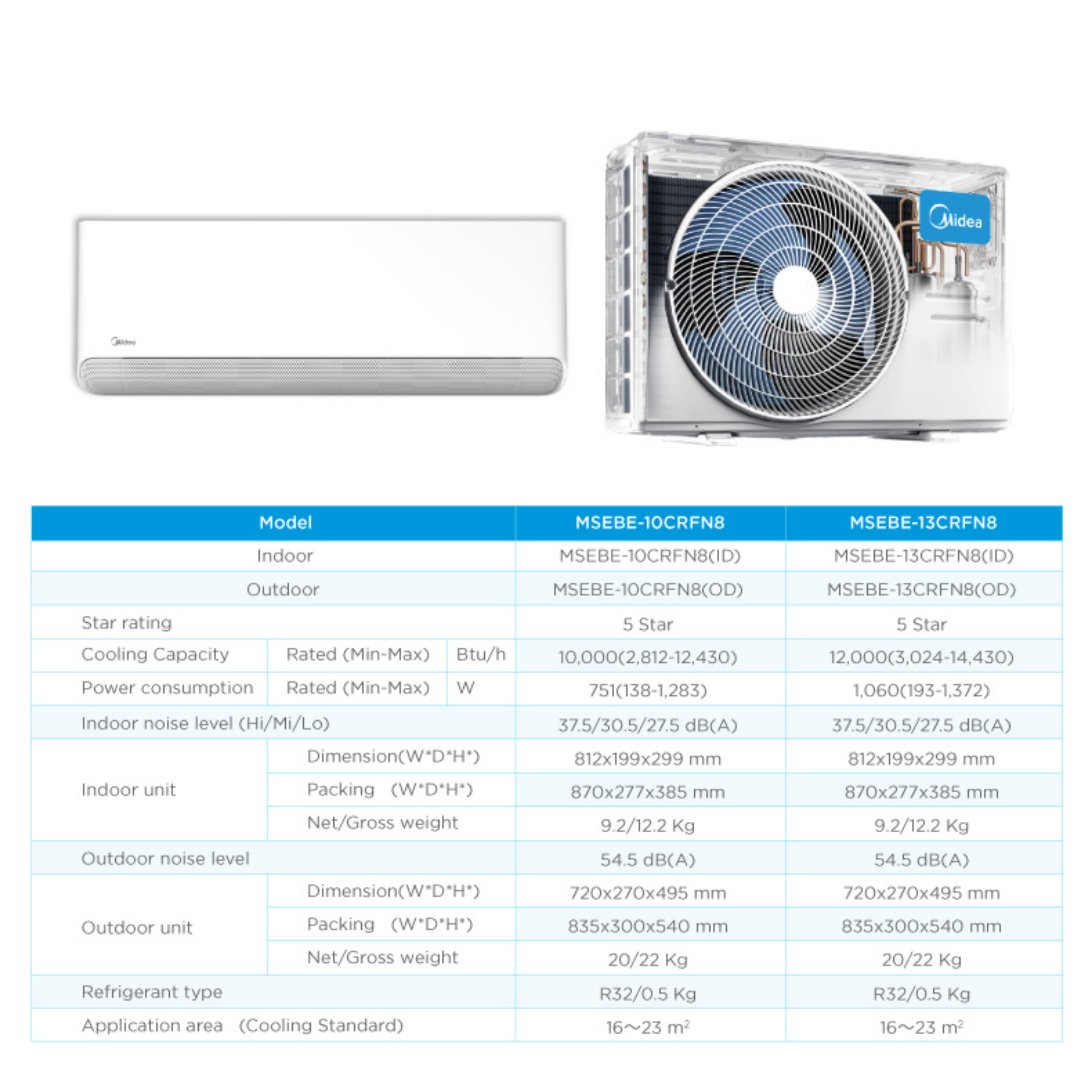 Midea 1.5HP Breezeless E Inverter Air Conditioner MSEBE-13CRFN8 Features: - Capacity: 1.5HP - Breezeless Cooling Technology - AI Ecomaster Energy Saving - Cool Flash Fast Cooling - Air Magic+ Purification - Inverter Technology Warranty: 2 Years General Warranty, 5 Years Compressor Warranty