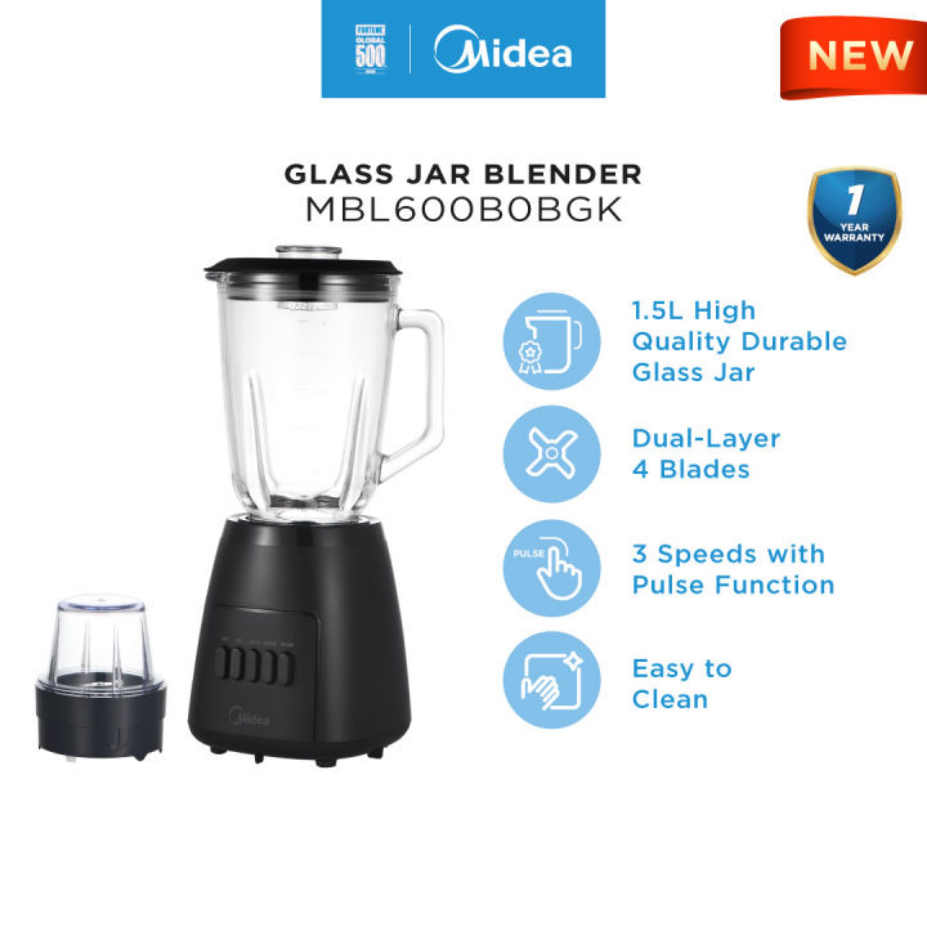 Midea 1.5L Table Blender Glass Jar With Grinder MBL600B0BGK