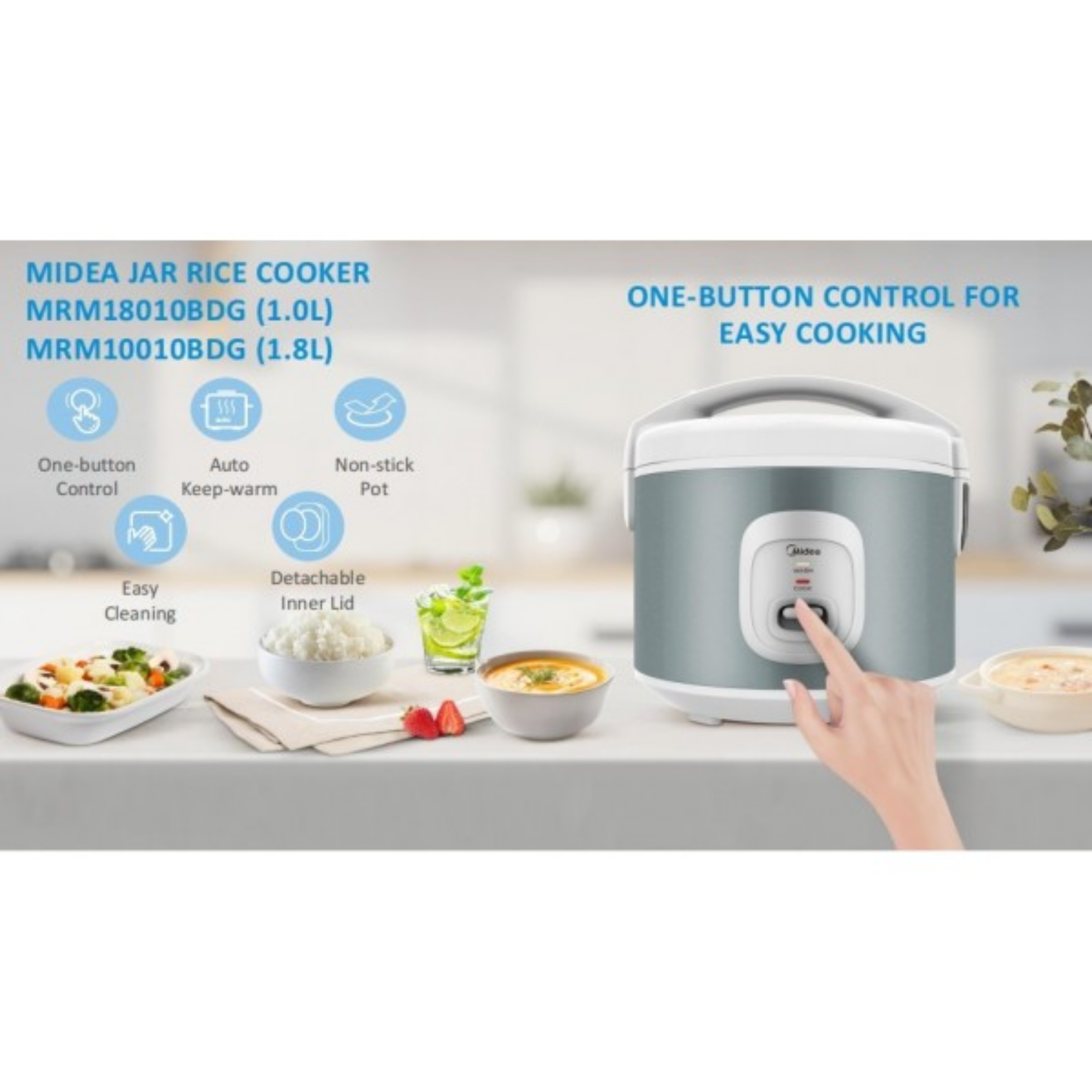 Midea 1.8L Jar Rice Cooker MRM18010BDG Features: - Capacity: 1.8L - One Touch Operation - Keep Warm Function - Non-Stick Inner Pot Warranty: 1 Year General Warranty