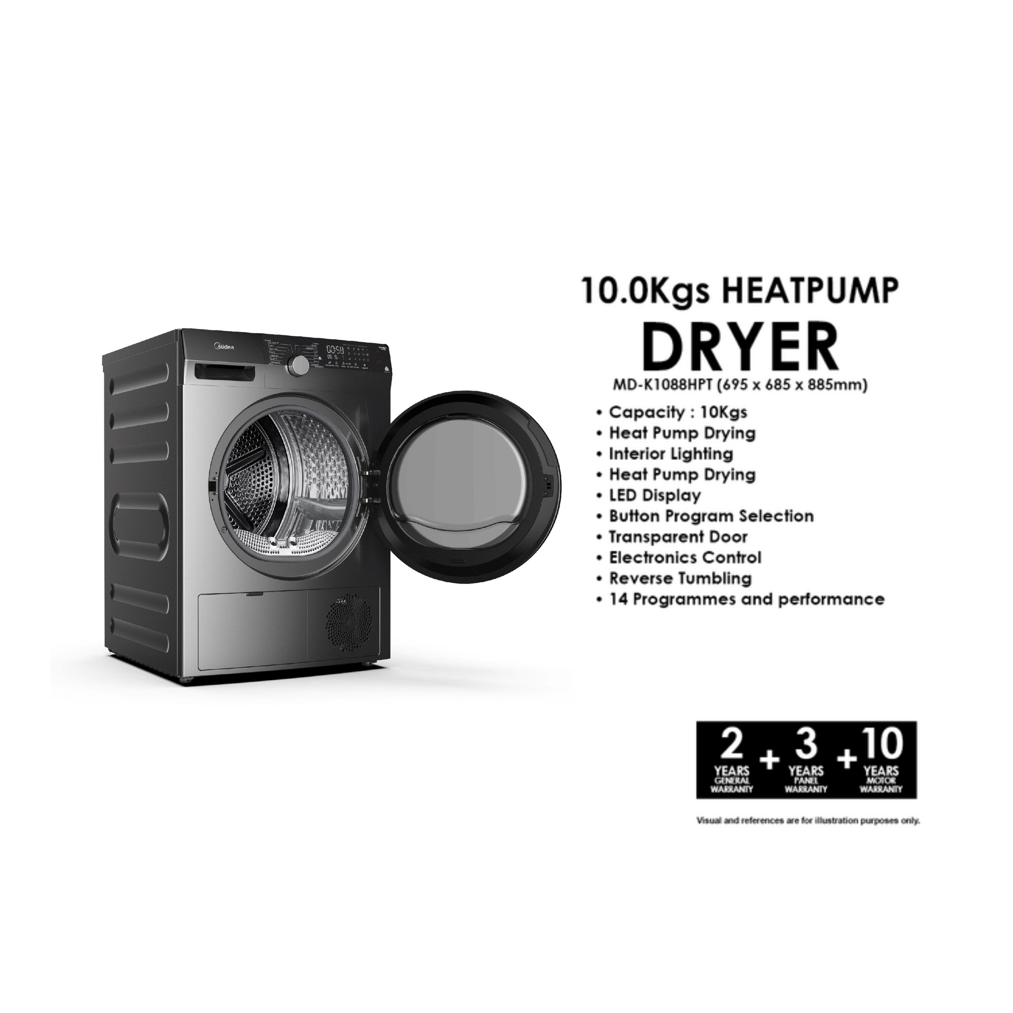 • Capacity : 10Kgs • Heat Pump Drying • Interior Lighting • Heat Pump Drying • LED Display • Button Program Selection • Transparent Door • Electronics Control • Reverse Tumbling • 14 Programmes and performance