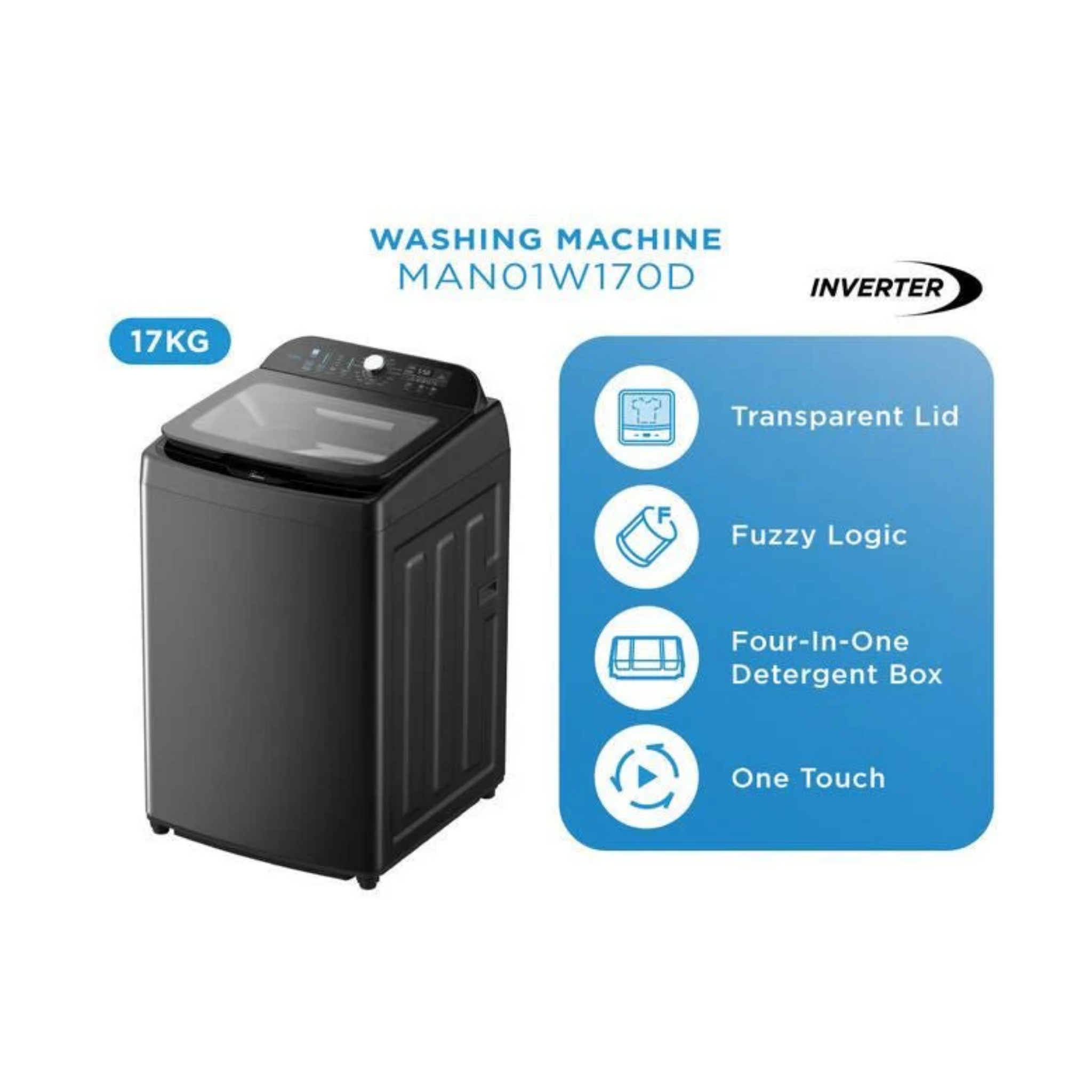 Midea 17kg Inverter Top Load Washer MAN01W170D Features: - Capacity: 17kg - Inverter Motor - One Touch Smart Wash - Water Cube Drum Warranty: 2 Years General Warranty, 3 Years Control Panel Warranty, 10 Years Motor Warranty