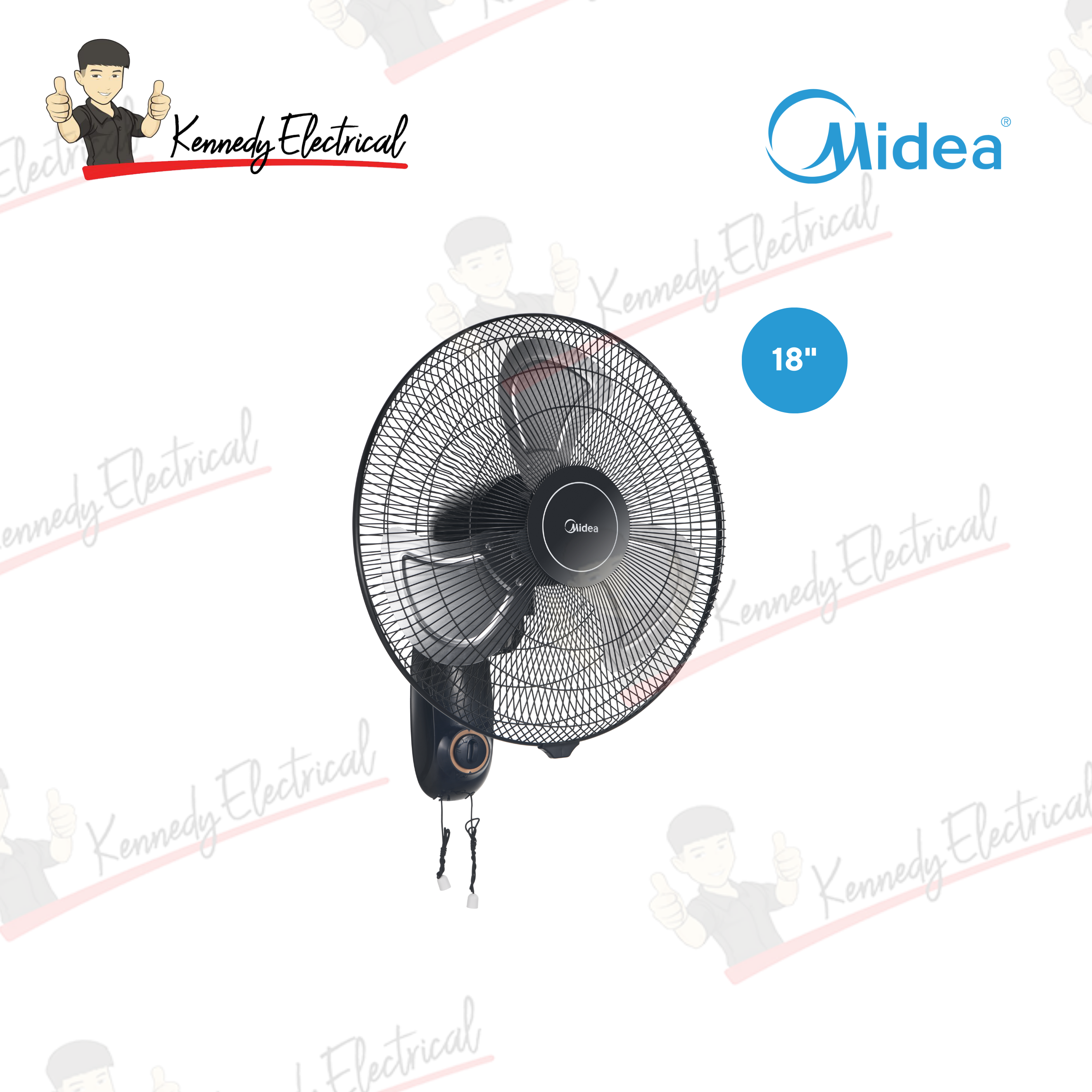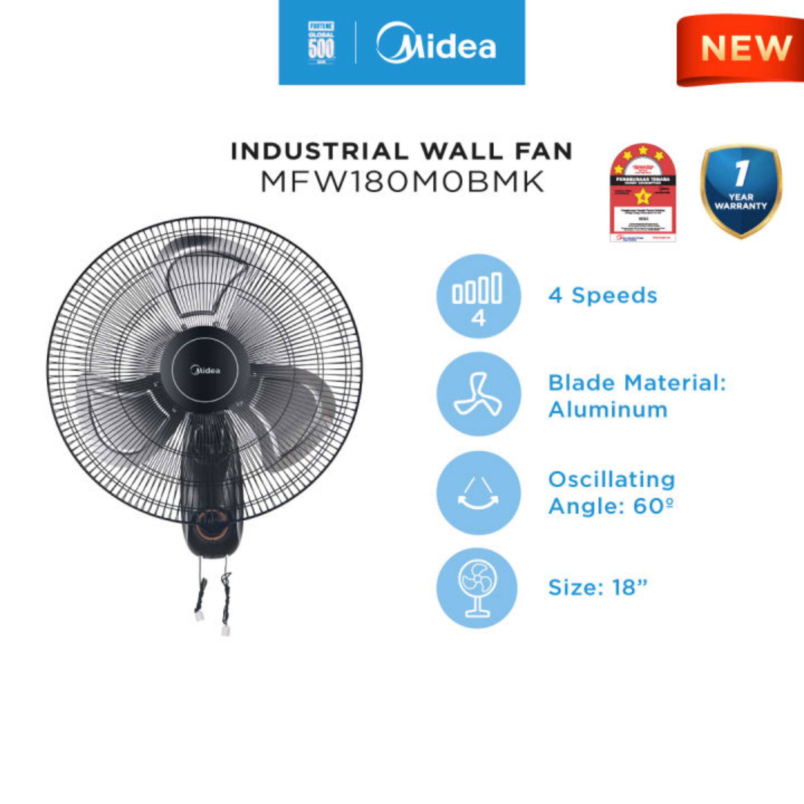• Size: 18" • Type: Industrial Wall Fan • Features: 3 Aluminium Blades, 4 Speed, Strong Wind • Warranty: 1 Year General Warranty