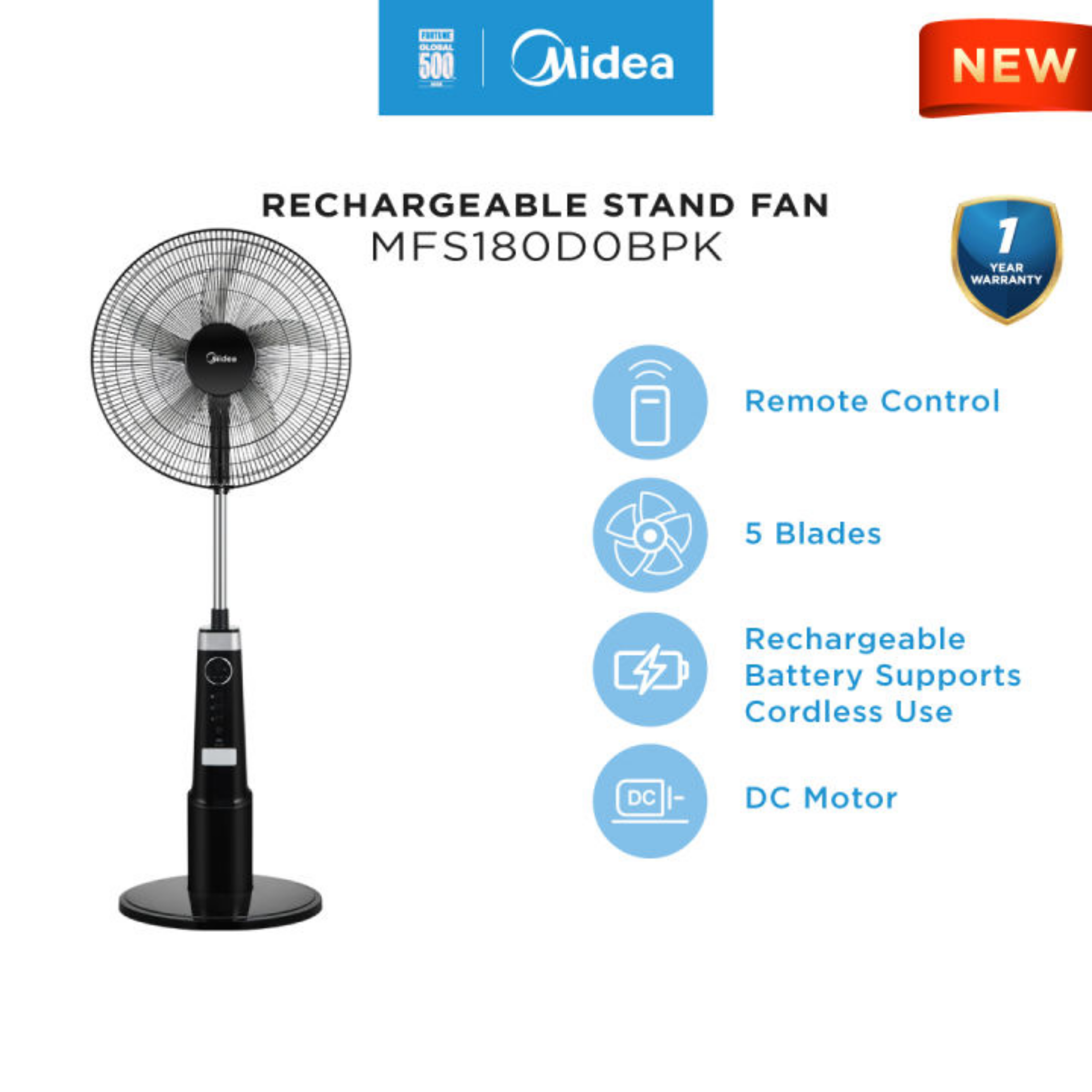 Midea 18 Inch Stand Fan MFS180D0BPK Features: - 18 Inch Blade Size - Rechargeable Battery - 9 Speed Levels - DC Motor Warranty: 1 Year General Warranty
