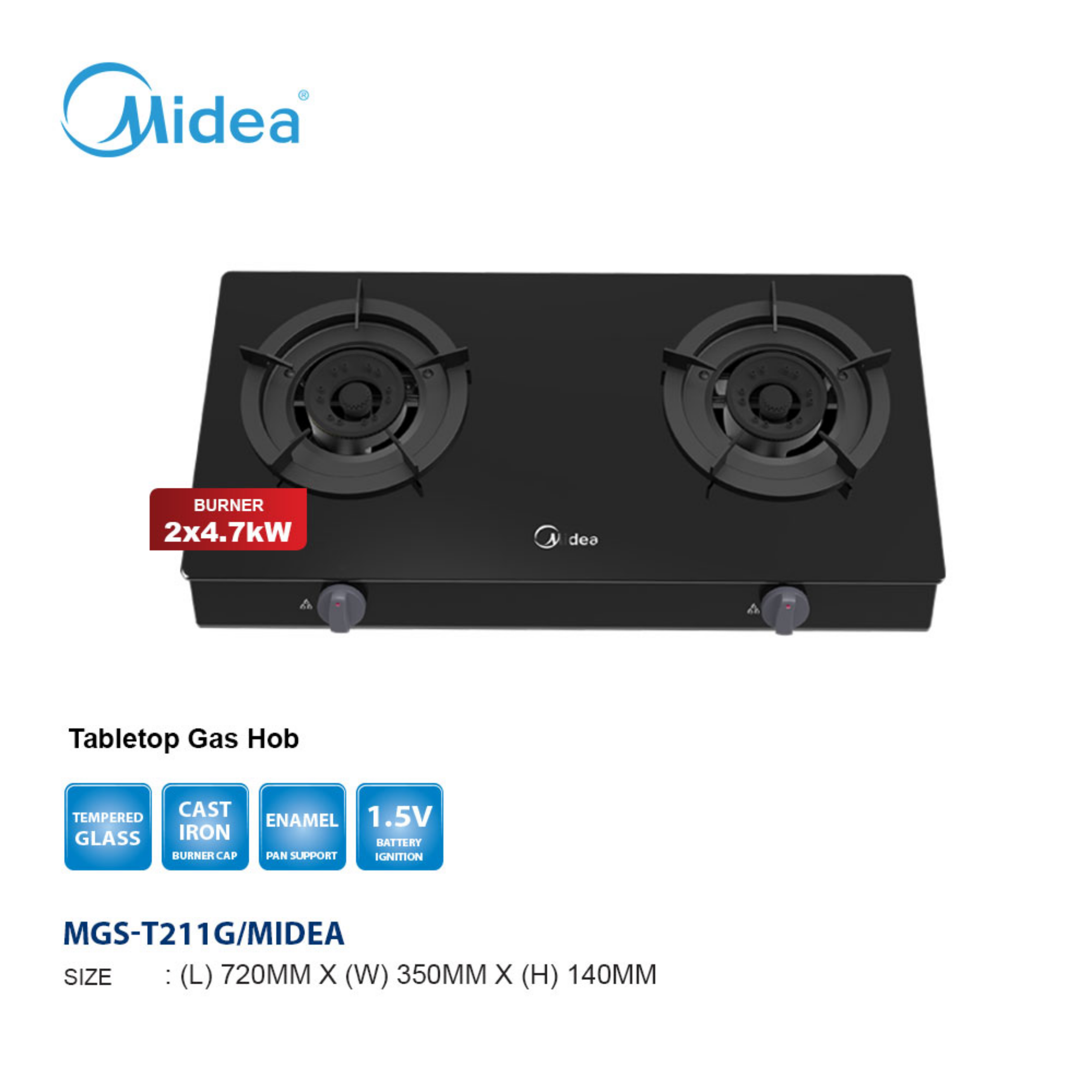 Midea 2 Burner Gas Stove MGS-T211G Features: - High Efficiency Burners - Flame Failure Safety Device - Cast Iron Pan Support - Stainless Steel Top Warranty: 1 Year General Warranty