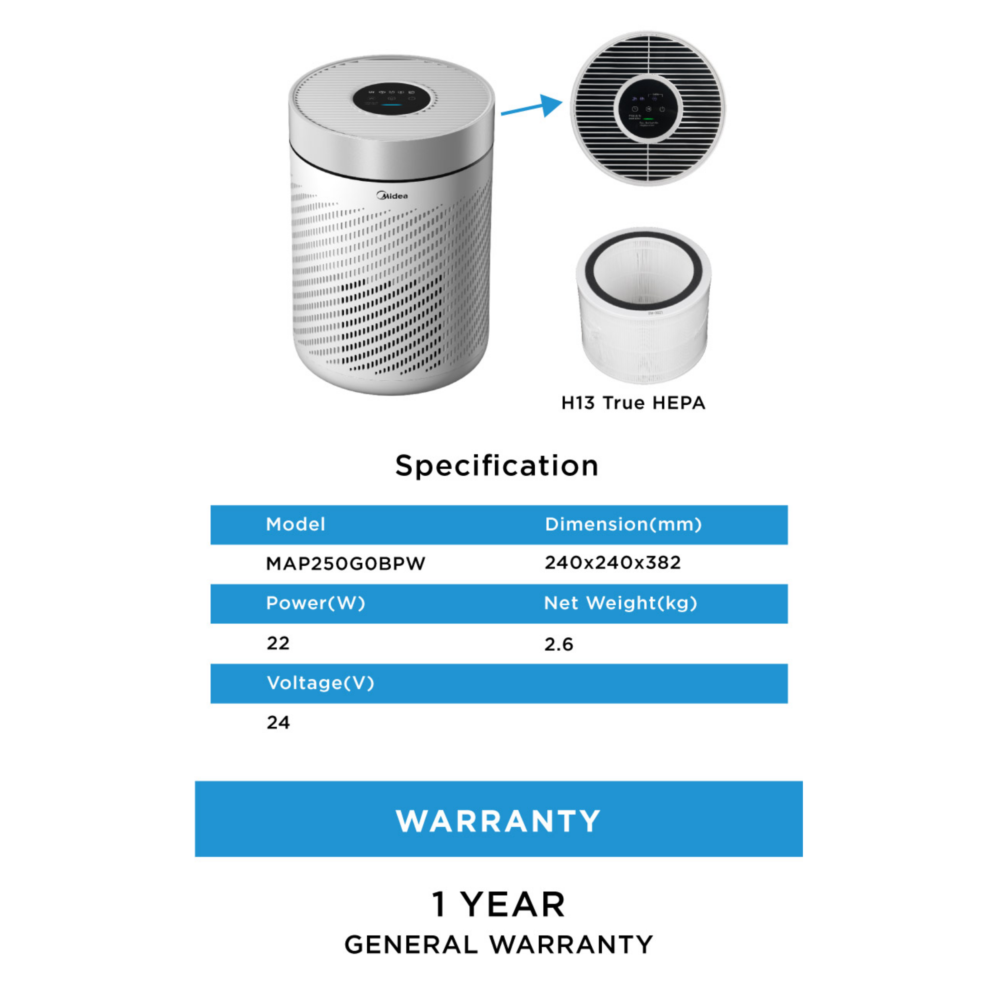 • CADR: 250m³/h • Type: Air Purifier • Features: H13 True HEPA Filter, UV Sterilization, Smart Sensor • Warranty: 1 Year General Warranty