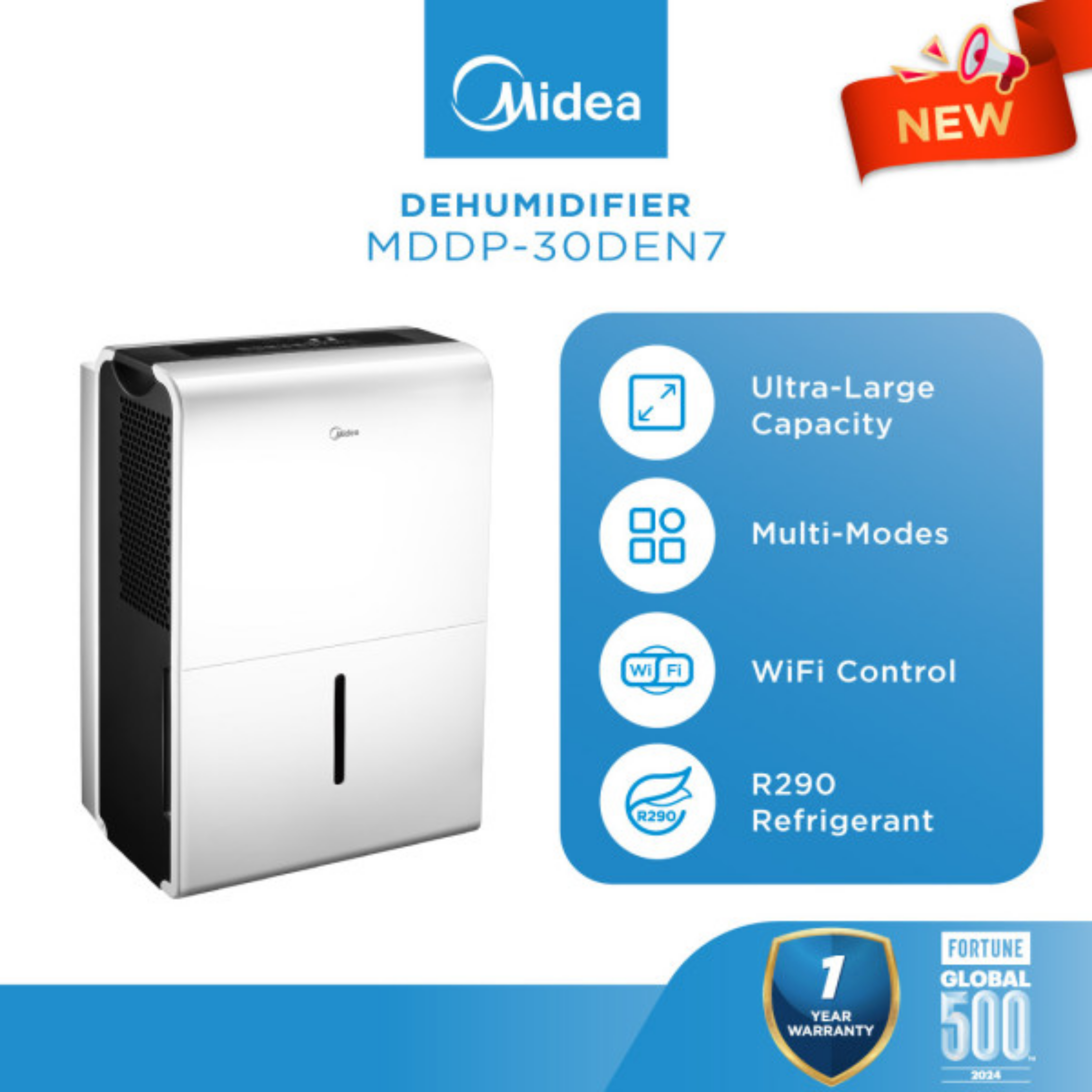 Midea 30L Smart Dehumidifier MDDP-30DEN7 Features: - Capacity: 30L/Day - Smart Humidity Control - Smart Control (App Supported) - Large Coverage Area - R290 Eco-friendly Refrigerant - Portable with Castor Wheels Warranty: 1 Year General Warranty