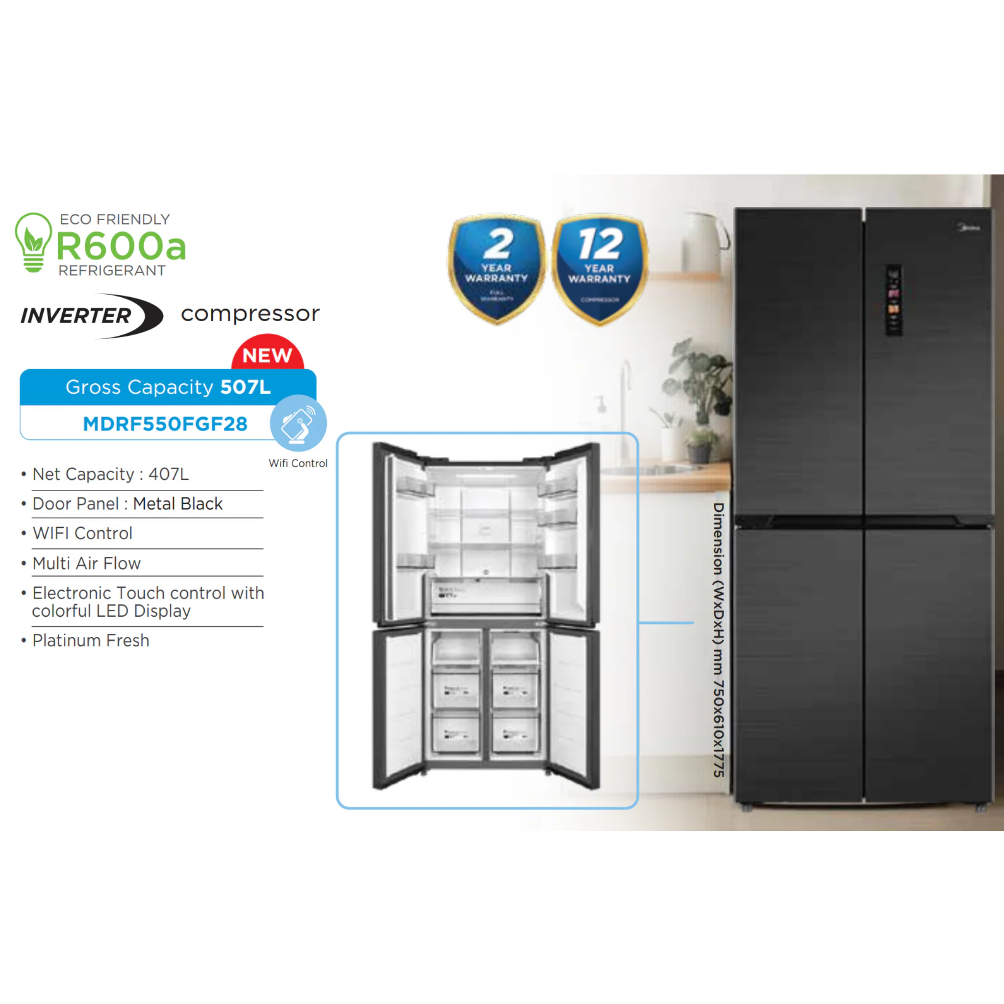 • Gross Capacity : 507L • Inverter Compressor • Multi Air Flow System • PT Fresh : Platinum Fresh • LED Display Control • Interior LED light • Refrigerant: R600A