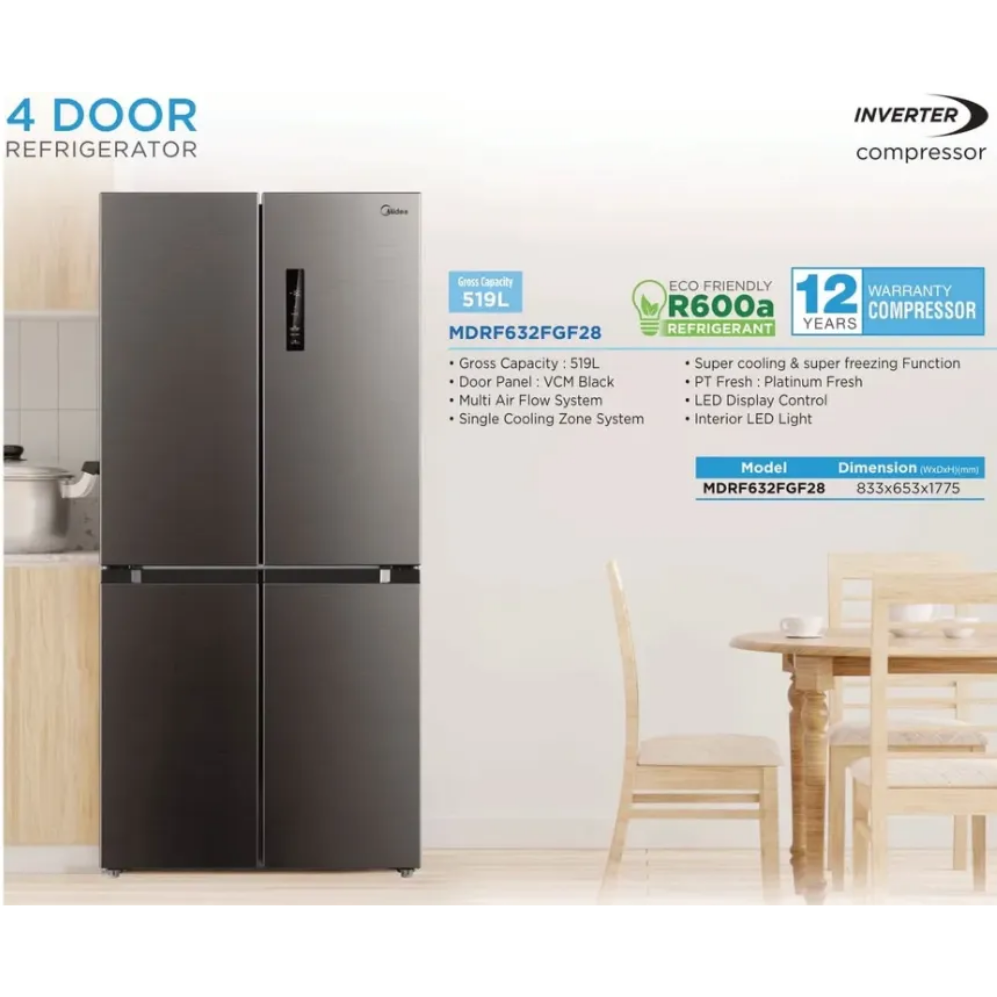 Midea 519L Multi Door Refrigerator MDRF632FGF28 Features: - Capacity: 519L - Inverter Quattro - Platinum Fresh - Multi Air Flow Warranty: 2 Years General Warranty, 12 Years Compressor Warranty