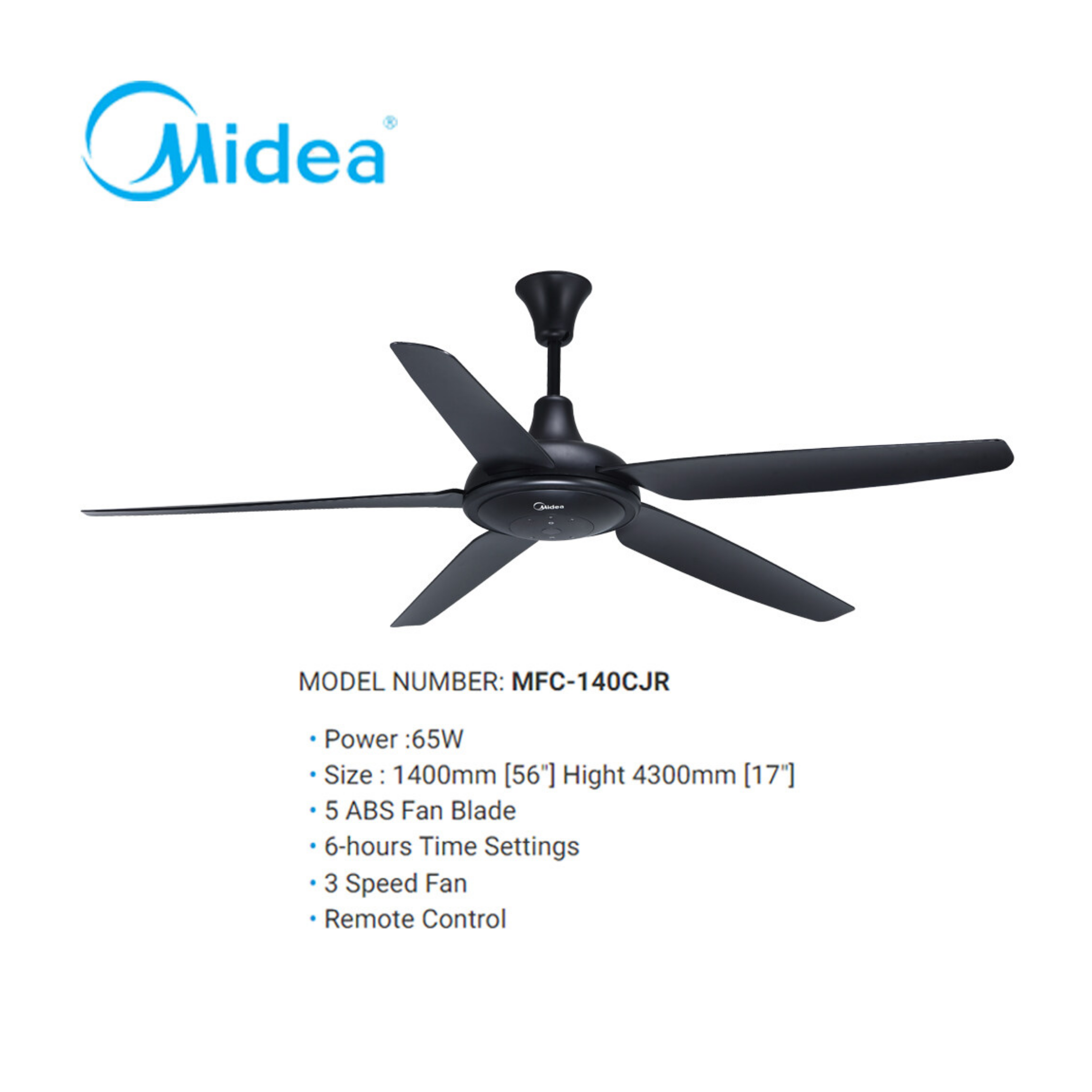 Midea 56 Inch Ceiling Fan MFC-140CJR Features: - 3 Speed Selection - Wide Oscillation - Energy Efficient Motor Warranty: 1 Year General Warranty, 3 Years Motor Warranty