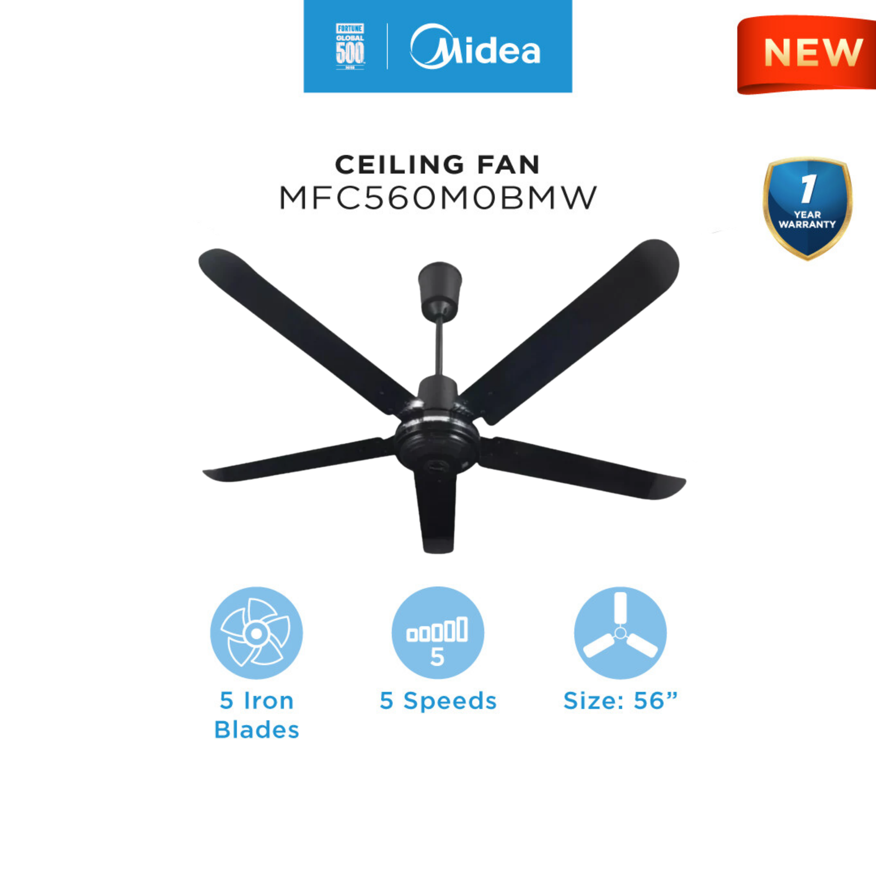 Midea 56 Inch Ceiling Fan MFC560M0BMK (Black) Features: - 56 Inch Blade Size - 5 Speed Regulator - 5 Blades Design - Double Safety Mechanism Warranty: 1 Year General Warranty, 3 Years Motor Warranty