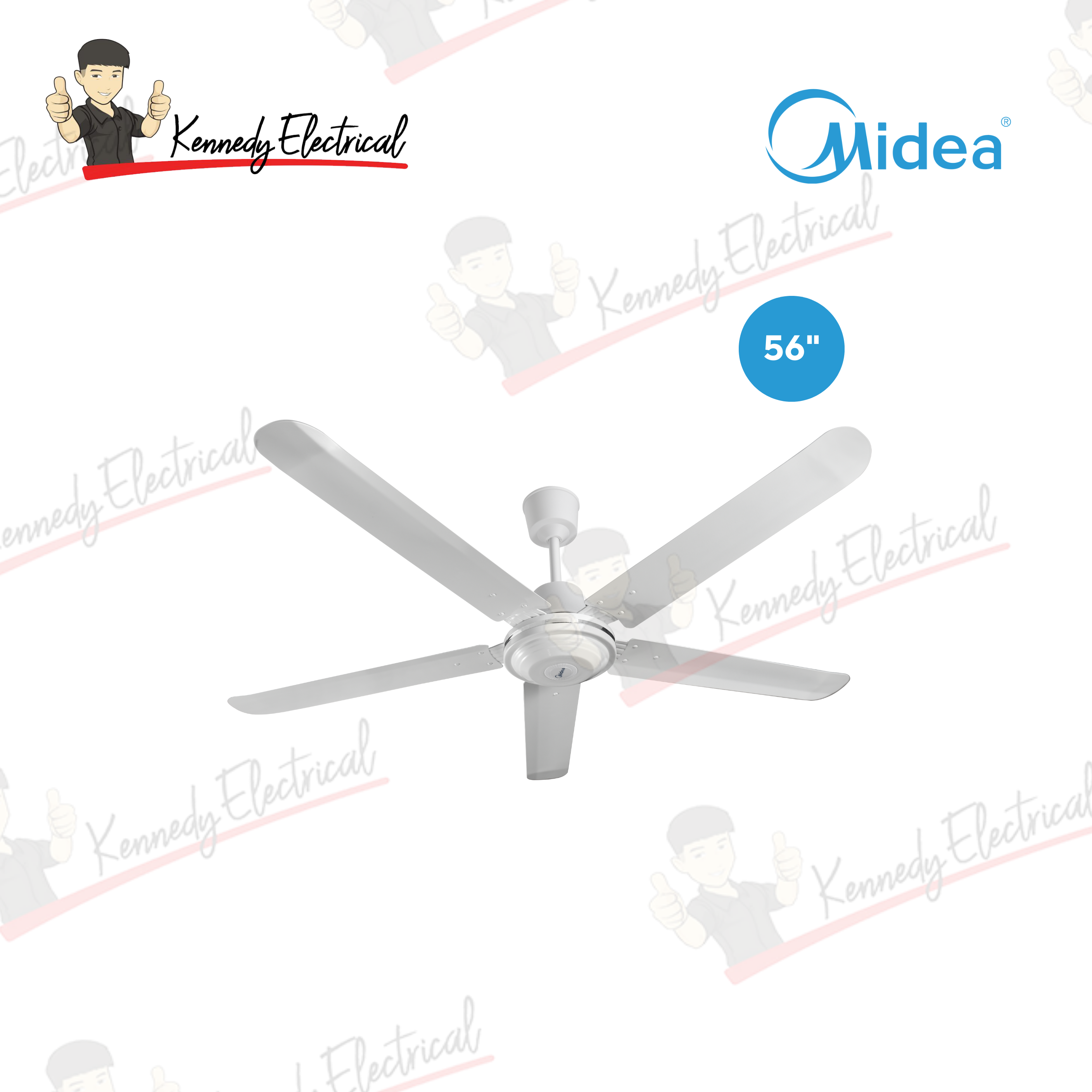 Midea 56 Inch Ceiling Fan MFC560M0BMW (White) Features: - 56 Inch Blade Size - 5 Speed Regulator - 5 Blades Design - Double Safety Mechanism Warranty: 1 Year General Warranty, 3 Years Motor Warranty