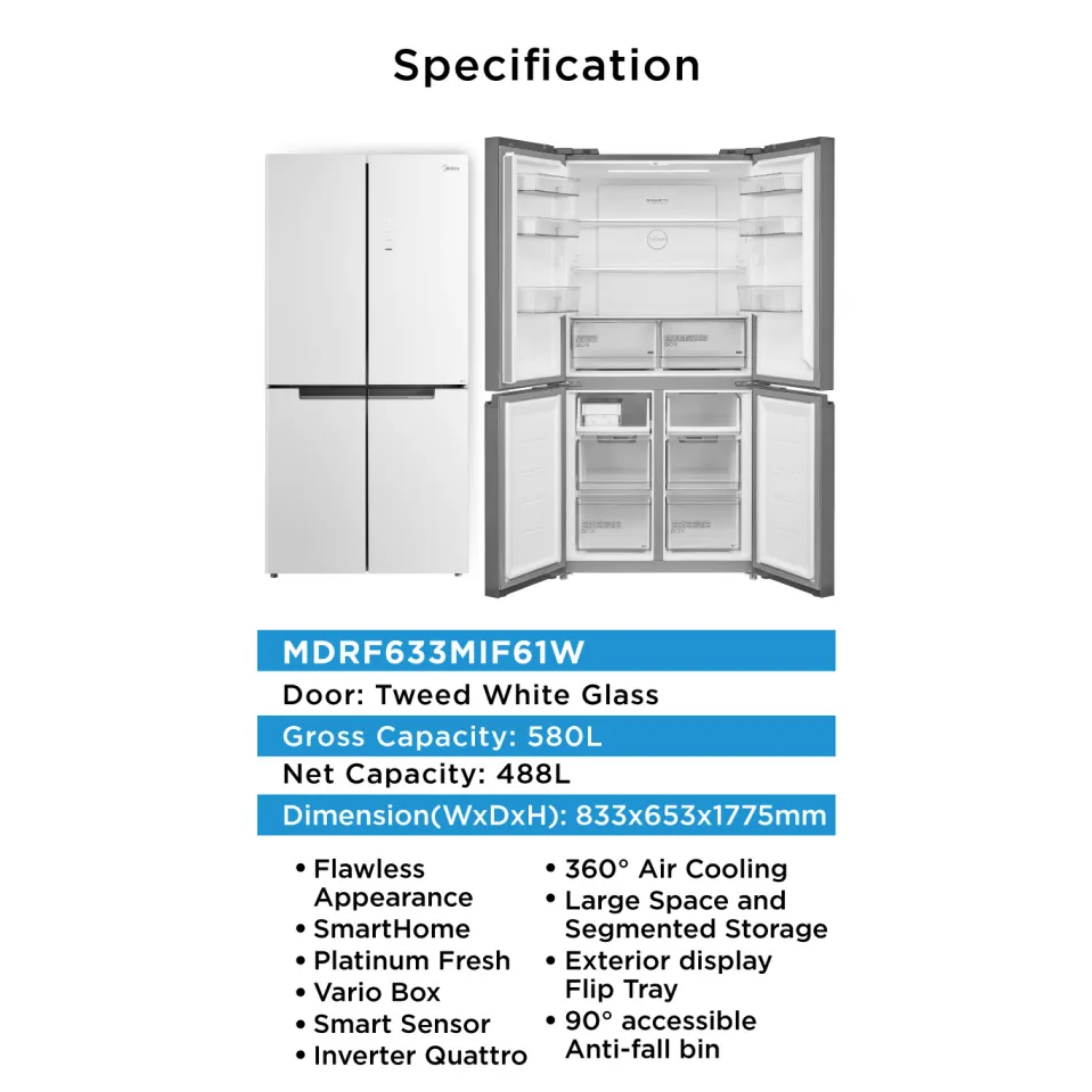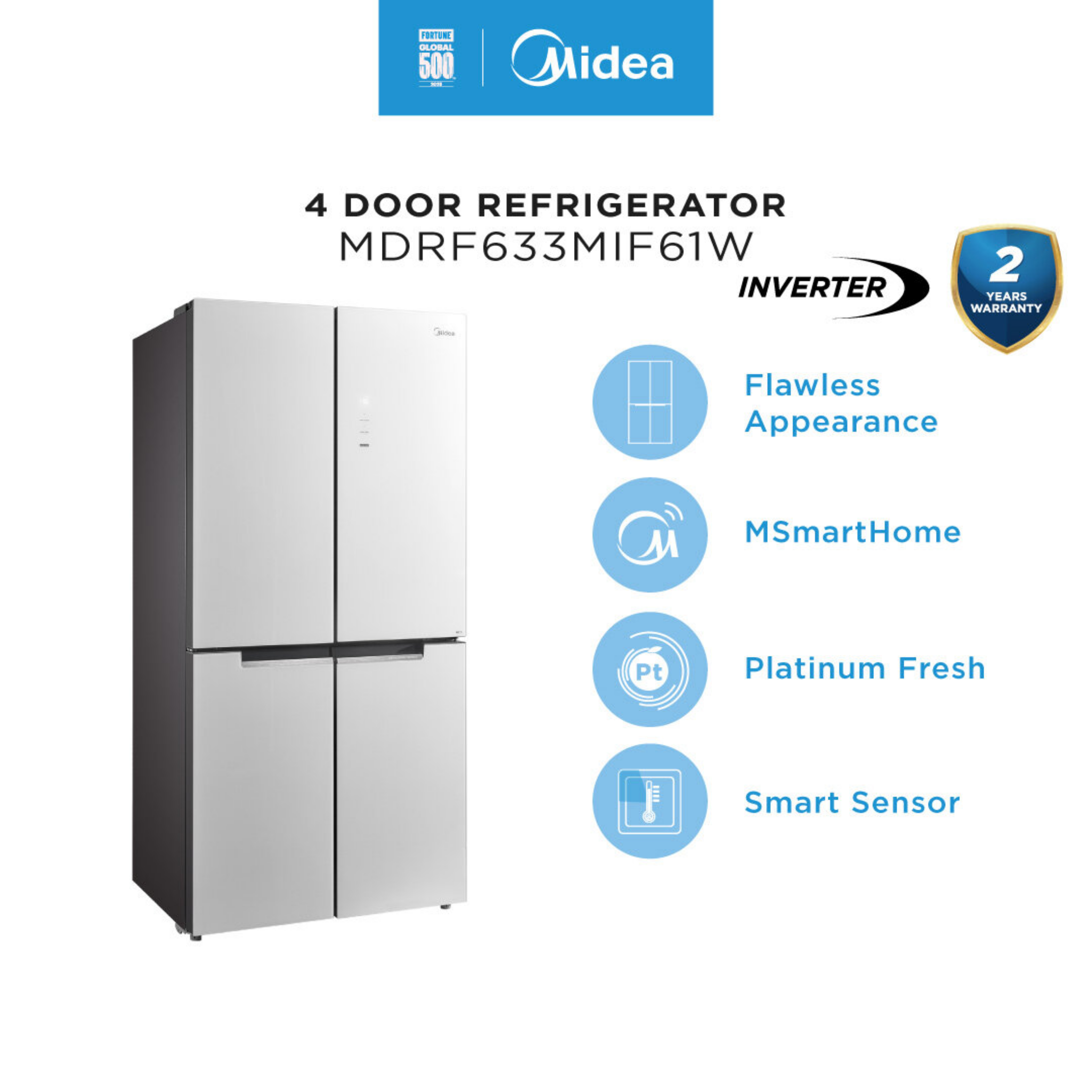 Midea 580L Multi Door Refrigerator MDRF633MIF61W Features: - Capacity: 580L - Inverter Quattro - Tweed White Design - Smart Control Warranty: 2 Years General Warranty, 12 Years Compressor Warranty