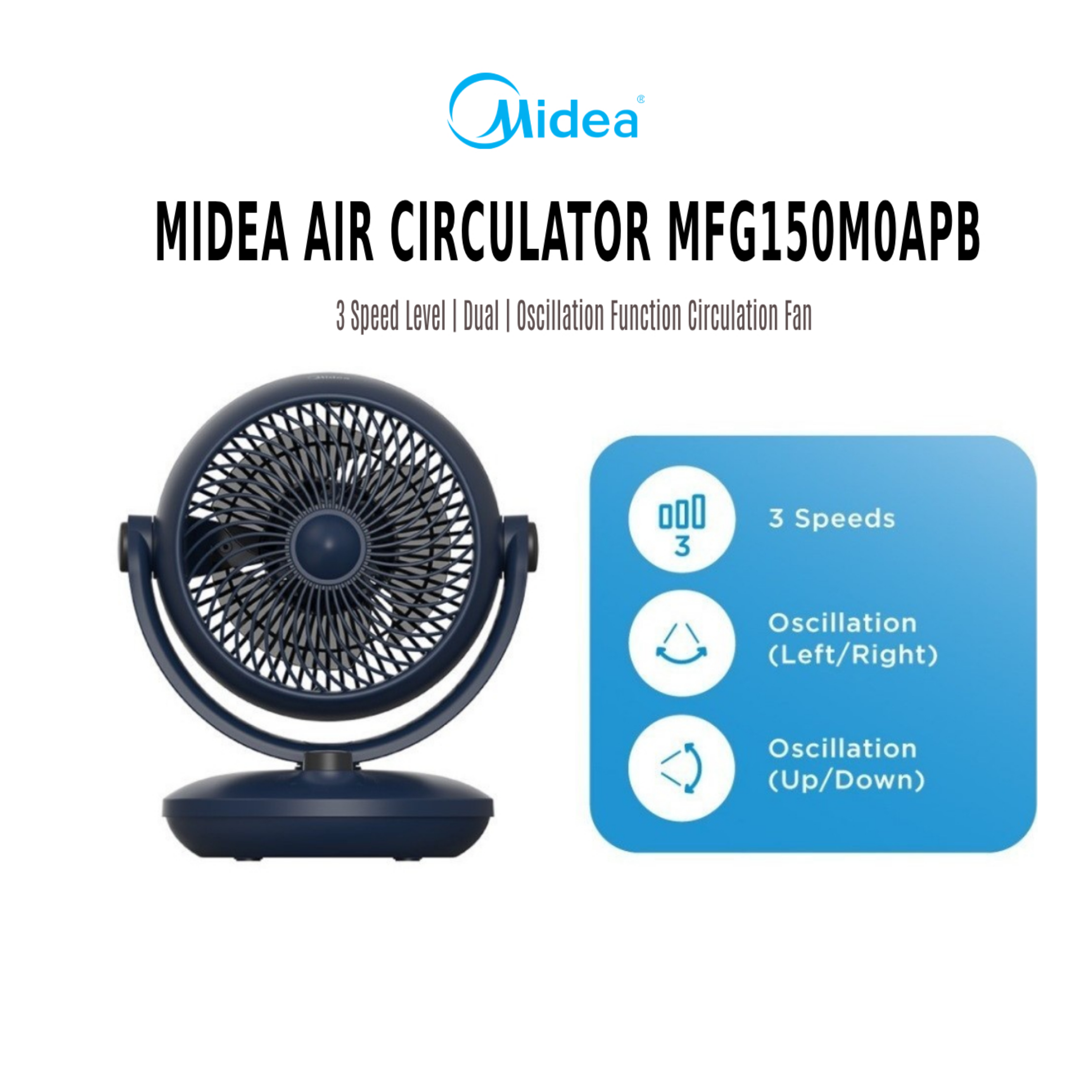 Midea 6 Inch Circulation Fan MFG-150MOAPB Features: - 6 Inch Blade Size - 3 Speed Selection - Mini Size - Direct Cool Warranty: 1 Year General Warranty