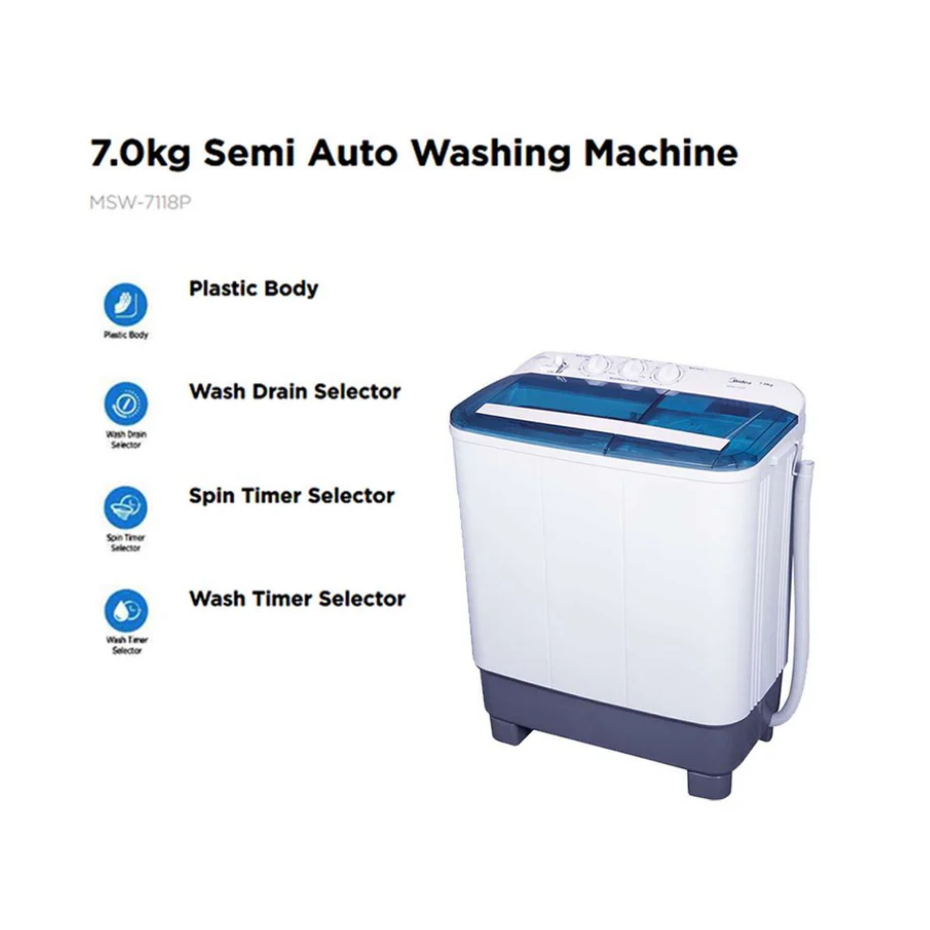 Midea 7.0kg Semi Auto Washer MSW-7118P Features: - Capacity: 7.0kg - Twin Tub Design - Powerful Pulsator - Durable Body Warranty: 1 Year General Warranty, 5 Years Motor Warranty