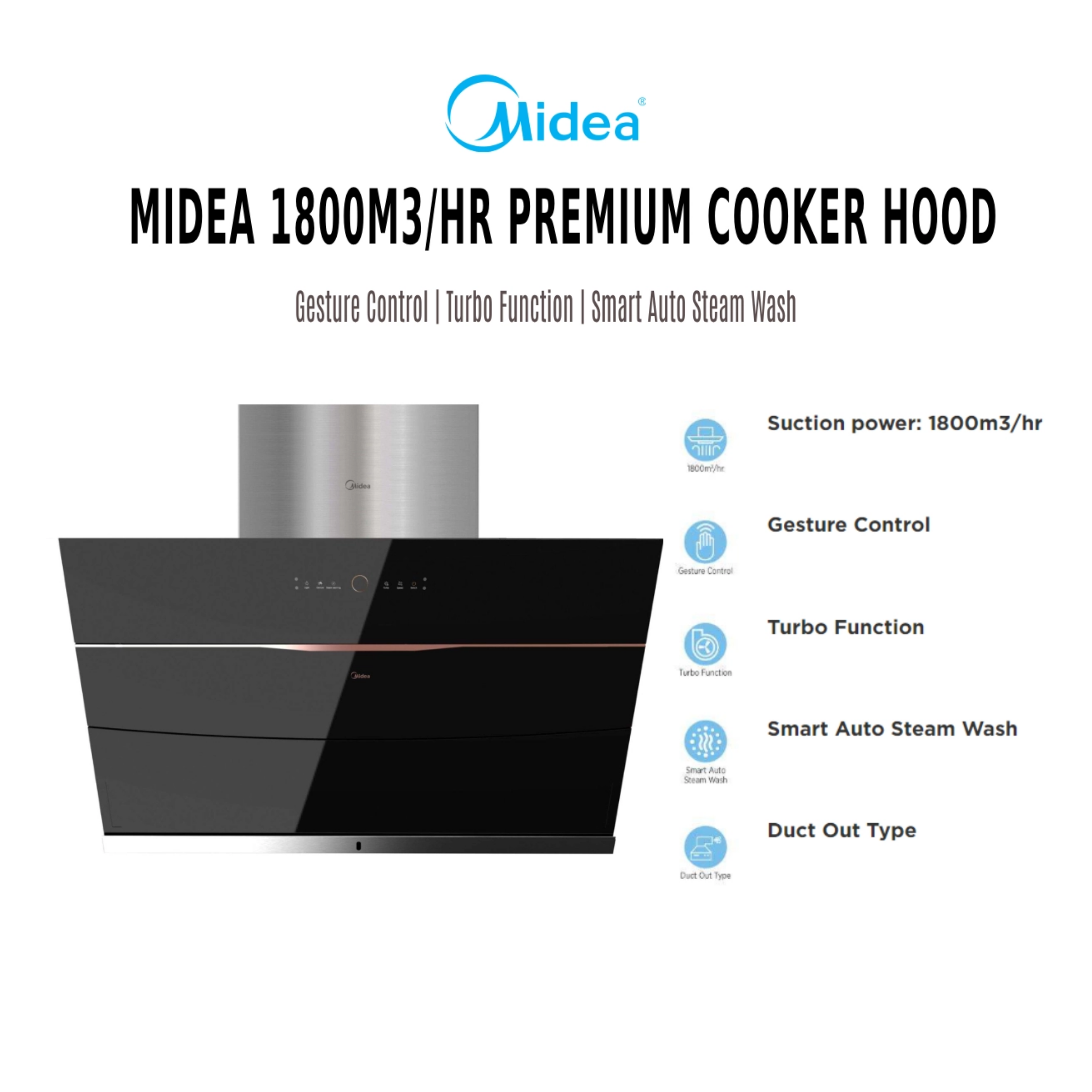 Midea 90cm Cooker Hood MCH-90B68AT(RFID) Features: - Capacity/Size: 90cm - High Suction Power - LED Lamp - Easy Clean Oil Cup Warranty: 1 Year General Warranty, 5 Years Motor Warranty