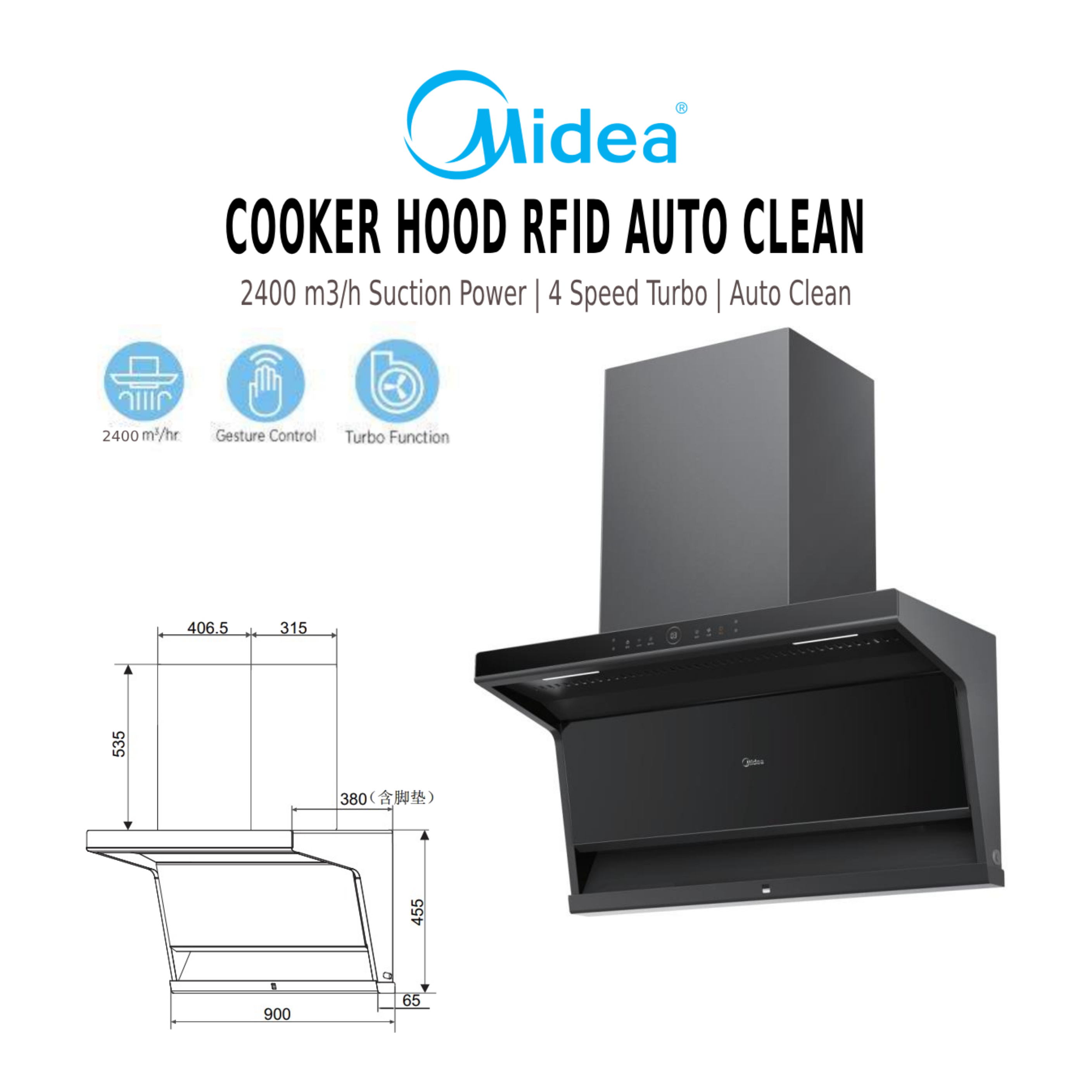 Midea 90cm Cooker Hood MCH-90X311(RFID) Features: - Capacity/Size: 90cm - High Suction Power - LED Lamp - Easy Clean Oil Cup Warranty: 1 Year General Warranty, 5 Years Motor Warranty