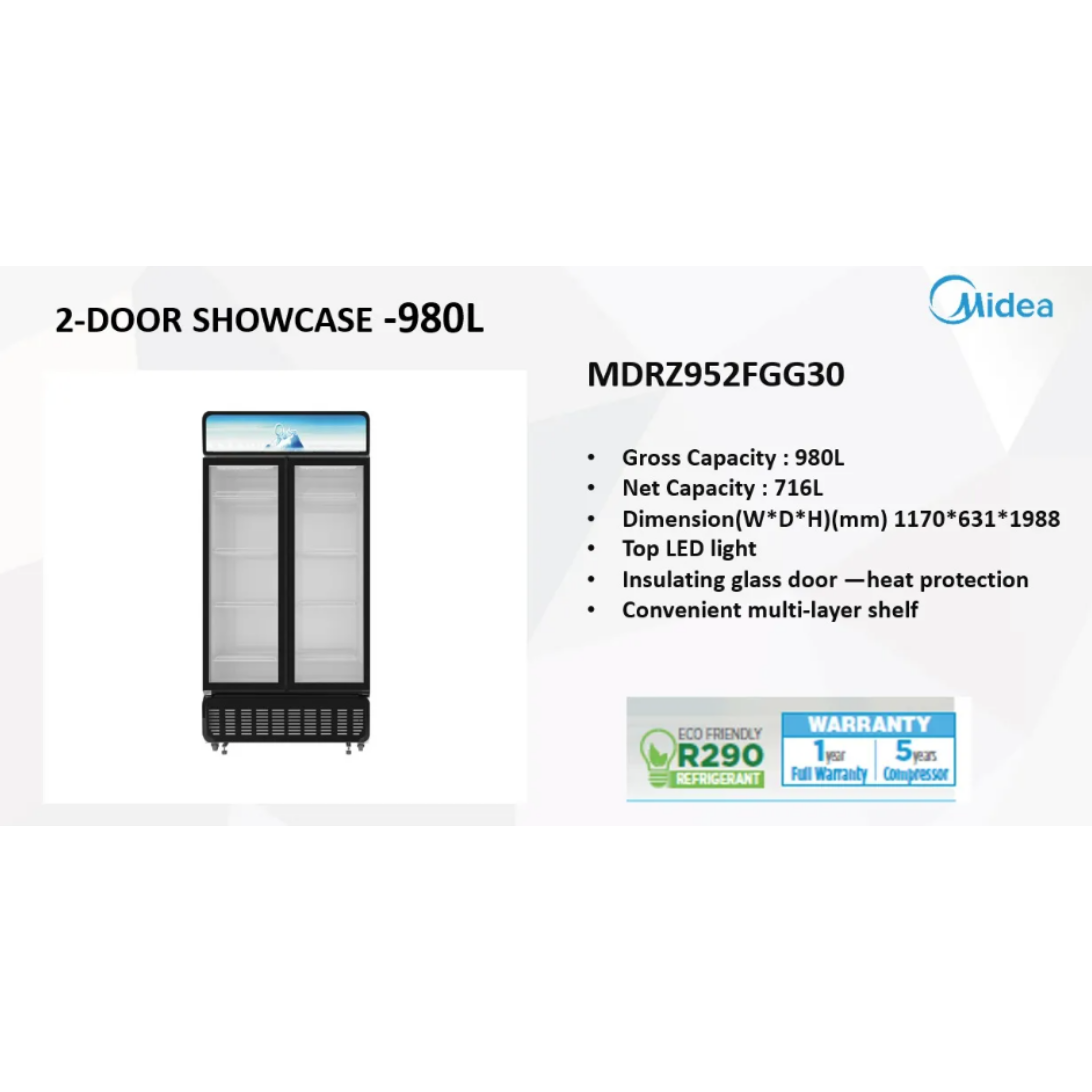 Midea 980L Showcase Chiller MDRZ952FGG30 Features: - Capacity: 980L - Double Door Showcase - Glass Door - Fan Cooling Warranty: 2 Years General Warranty, 5 Years Compressor Warranty