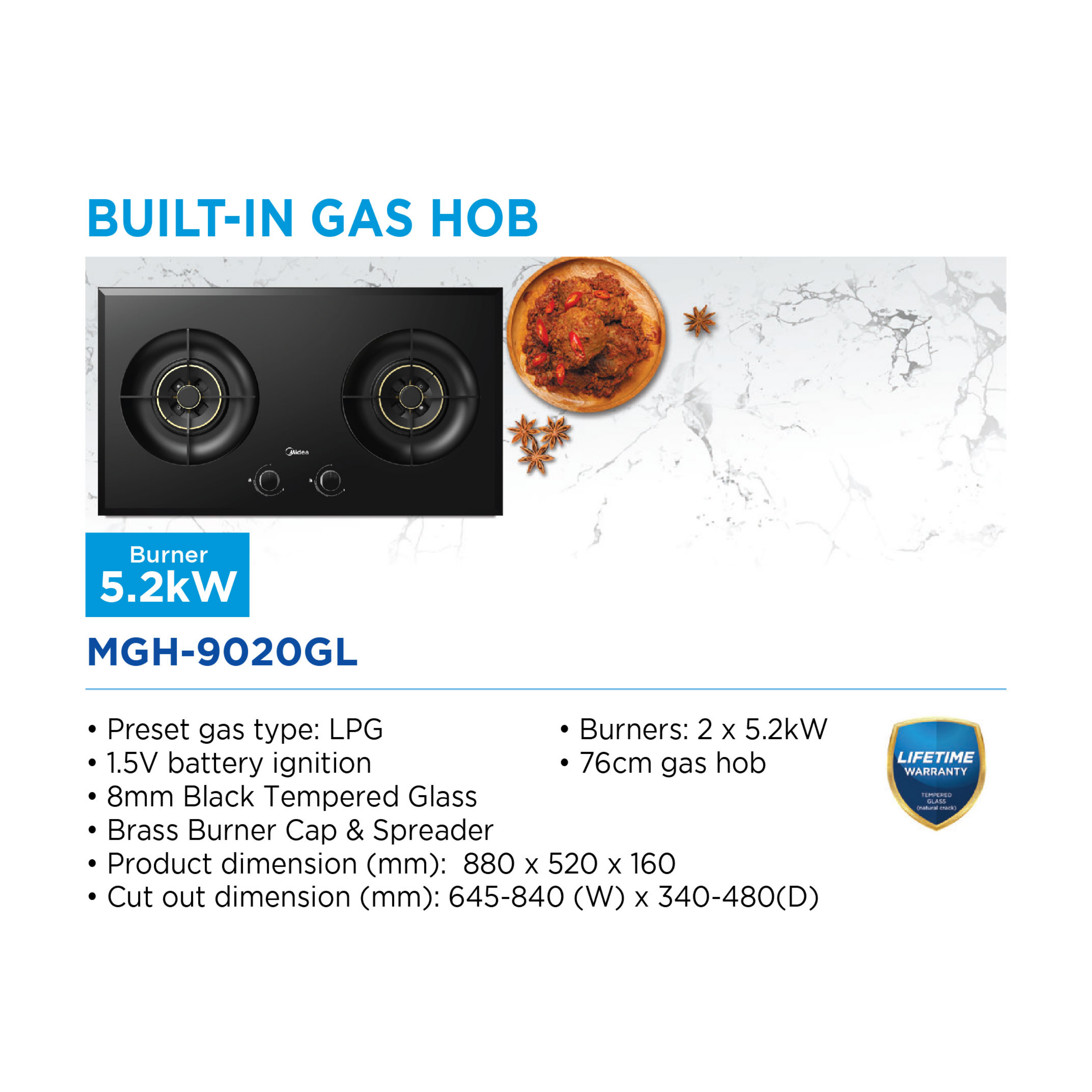 Midea Built-in Gas Hob MGH-9020GL Features: - High Efficiency Burners - Flame Failure Safety Device - Cast Iron Pan Support - Tempered Glass Top Warranty: 1 Year General Warranty, Lifetime Warranty on Tempered Glass (Natural Crack)