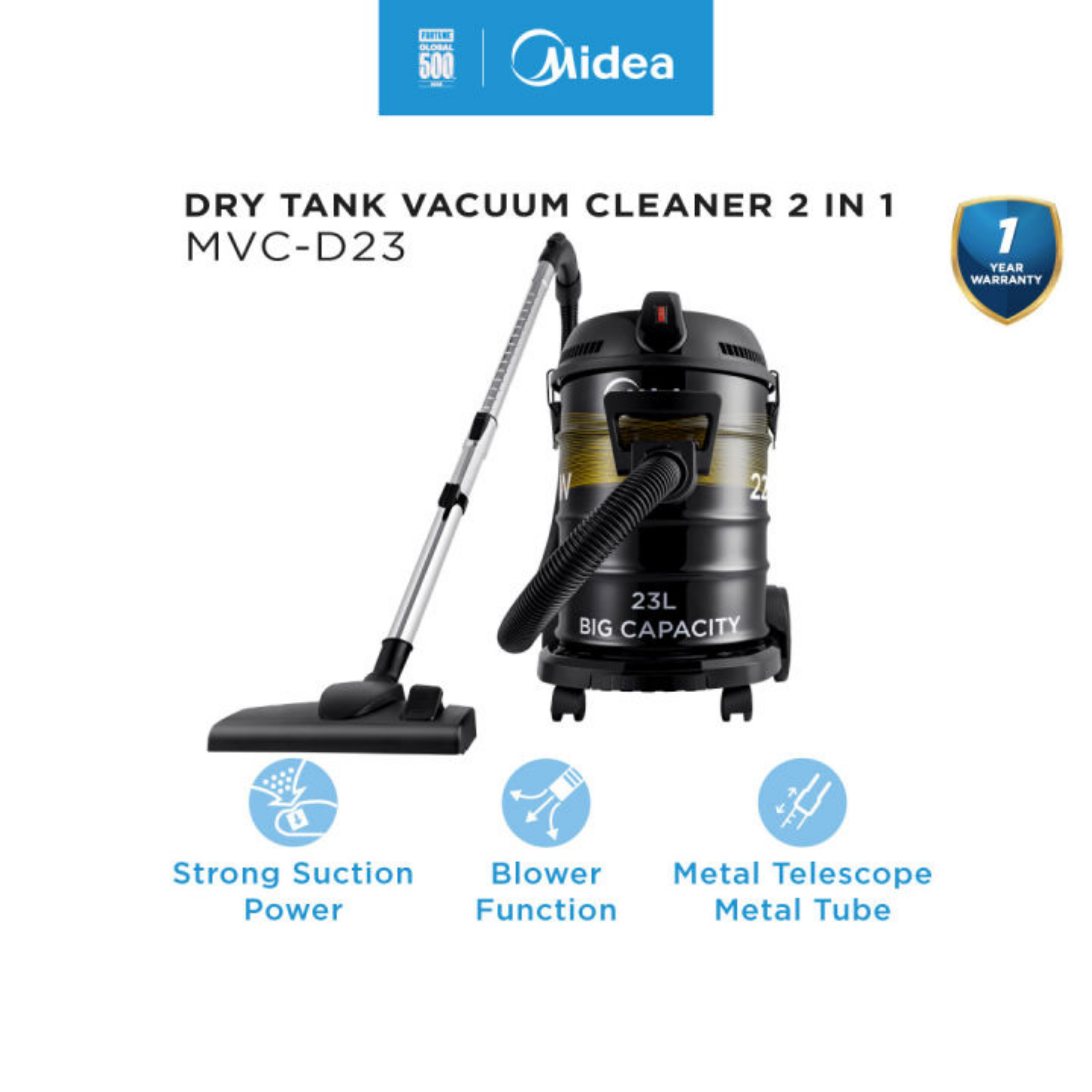 • Dry Use • Strong Suction Power • Strong Iron Body • Blower Function • Four Rotated Wheels for Easy Moving • 1.5m hose