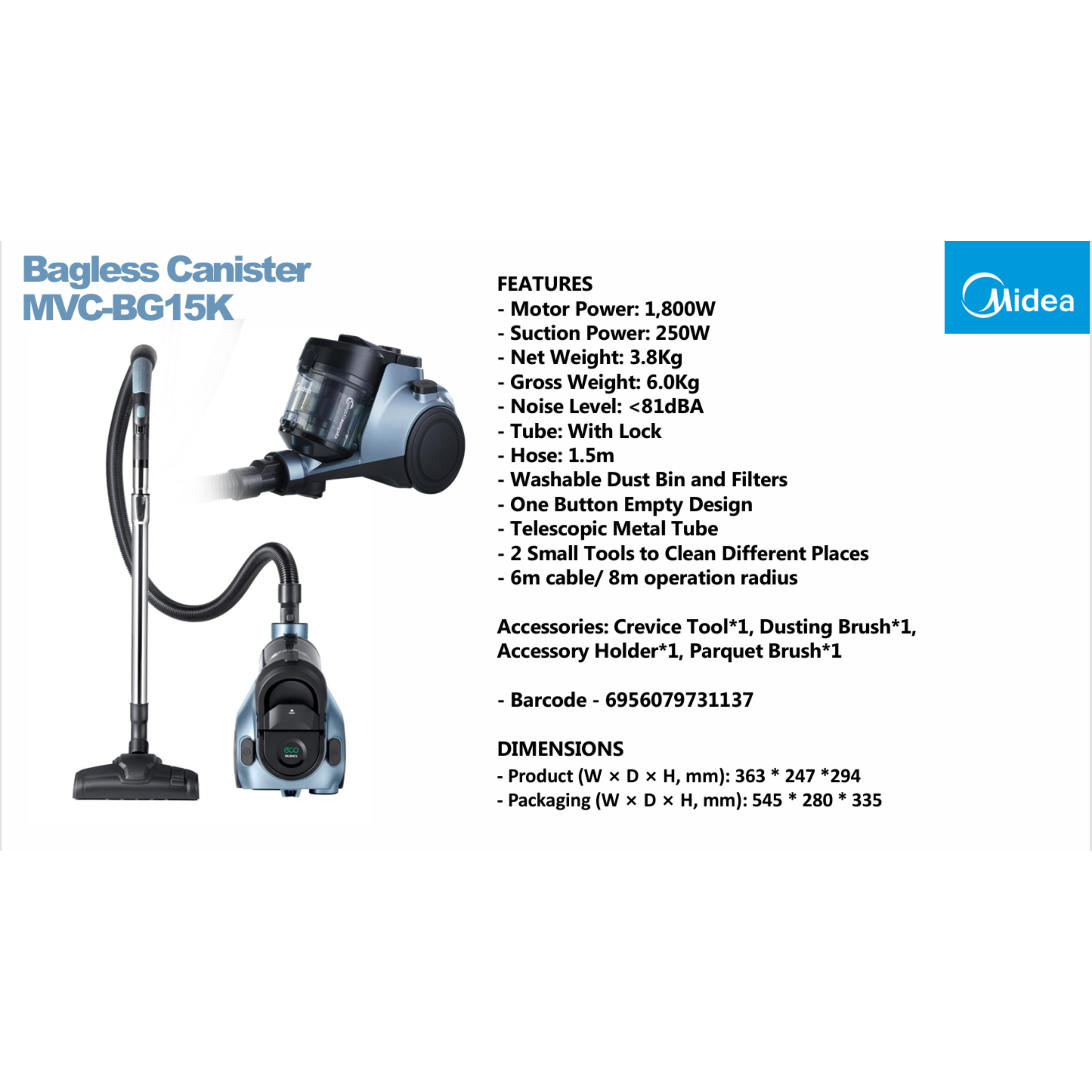 Midea Vacuum Cleaner MVC-BG15K Features: - High Suction Power - HEPA Filter Warranty: 1 Year General Warranty