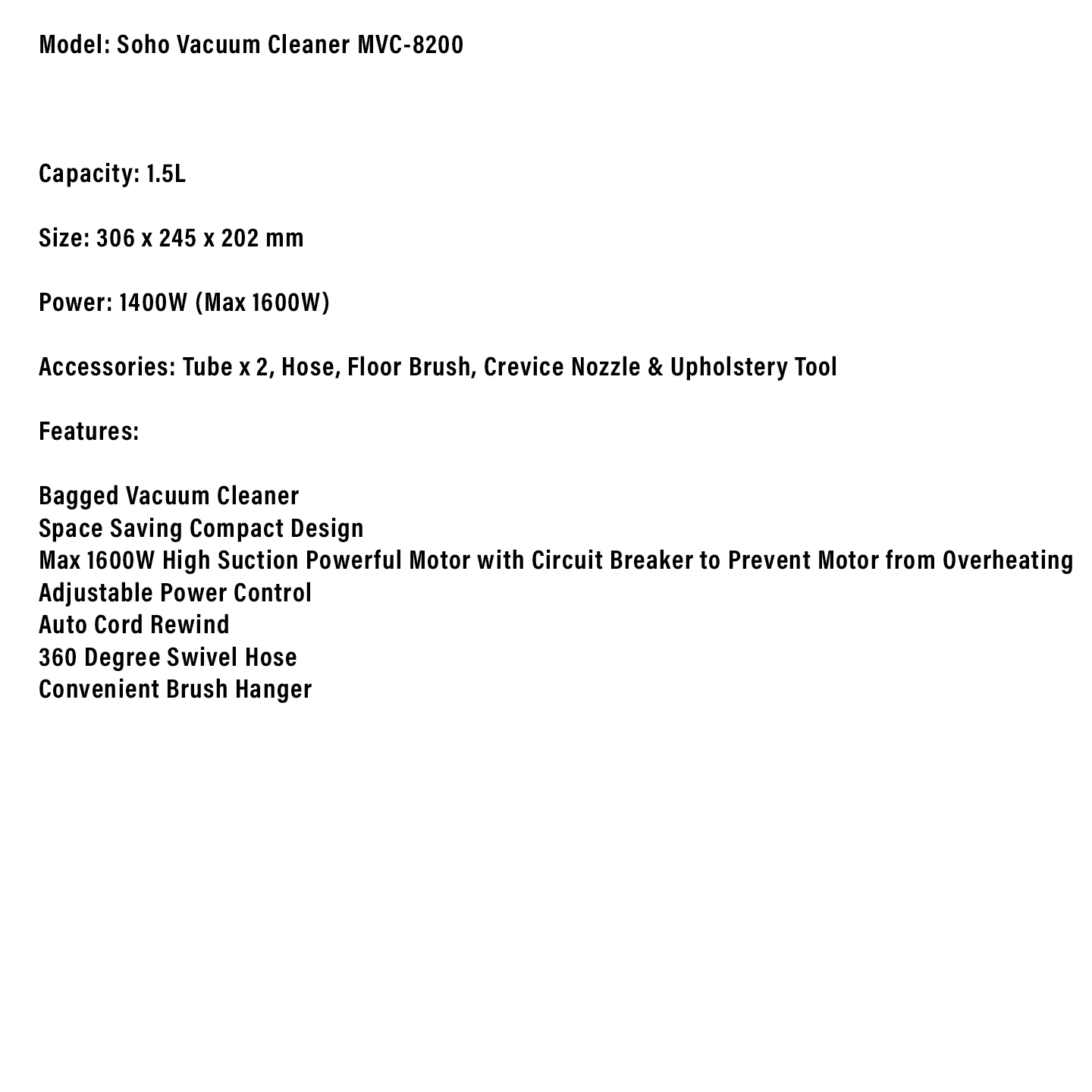 Milux 1.5L 1400W Soho Series Vacuum Cleaner (MVC-8200)