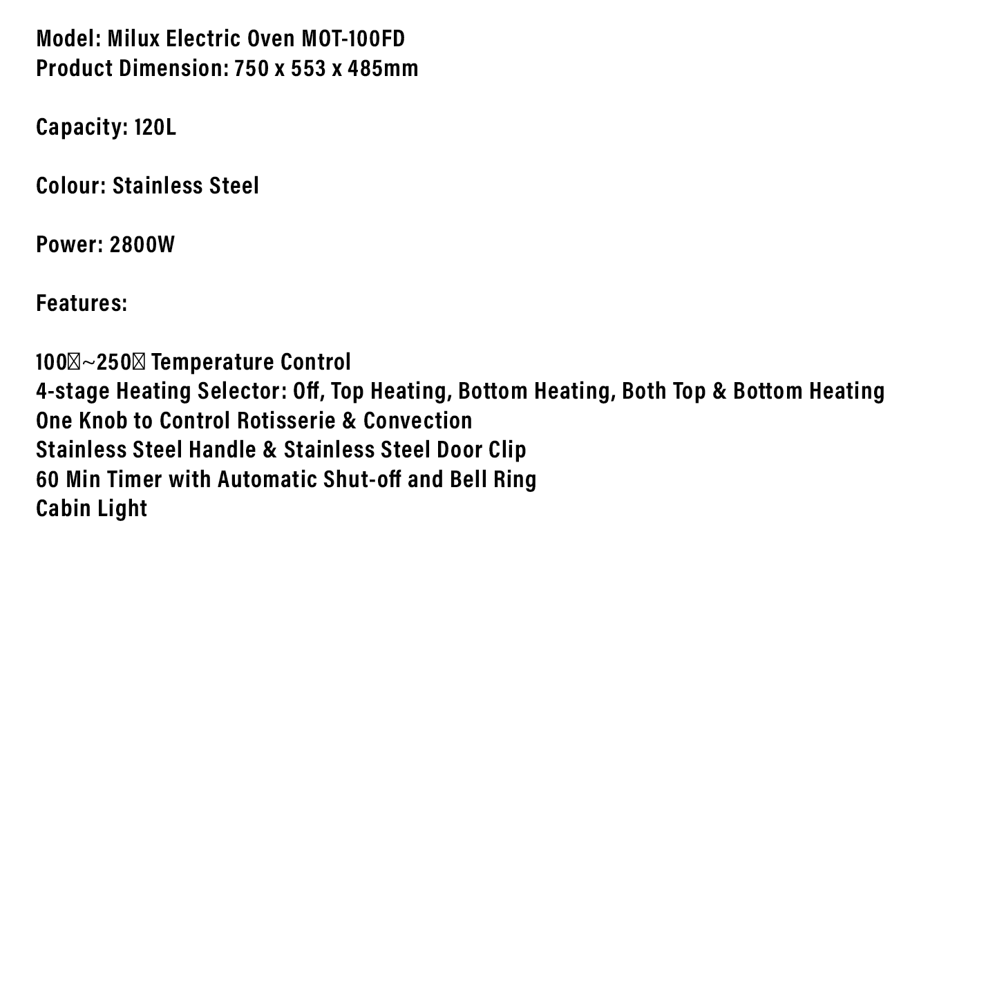 Buy Milux 120L Oven (MOT-120FD). Features massive capacity & dual temperature control. Original 1 Year Warranty. Shop now.