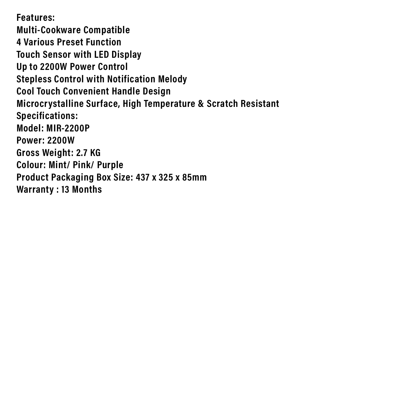 Buy Milux Infrared Cooker (MIR-2200P). Features touch control & suitable for all pots. Original 1 Year Warranty. Shop now.