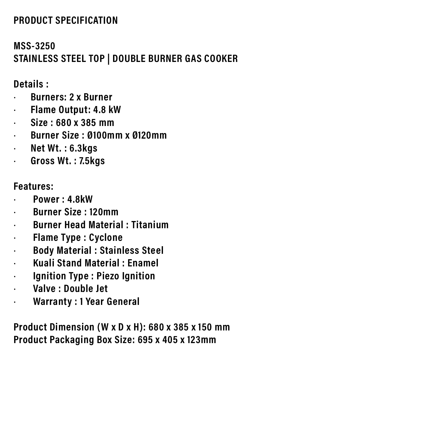 Buy Milux SS Gas Cooker (MSS-3250). Features tornado burner head & stainless steel body. Original 1 Year Warranty. Shop now.
