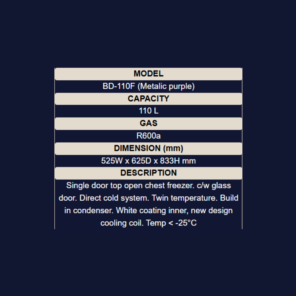 • Size: 525mm x 625mm x 833mm • Features: Twin temperature (chiller & freezer), Direct cold system (Temp < -25°C), White inner coating, Mechanical thermostat • Capacity: 110L • Color: Metallic Purple • Warranty: 1 Year General Warranty + 5 Years Compressor Warranty