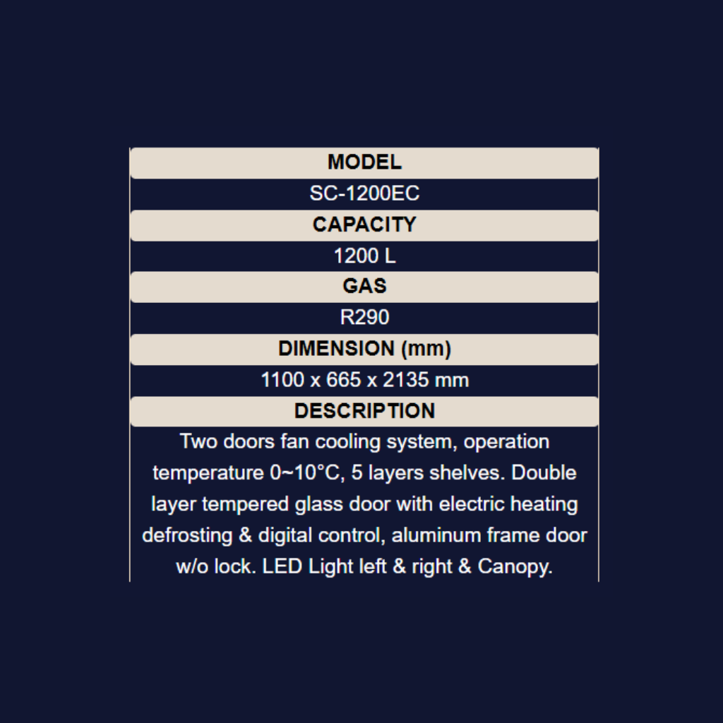 • Features: Digital thermostat, Fan cooling system (0-10°C), Double layer tempered glass door with electric heating, Aluminum frame door, Top-mounted compressor