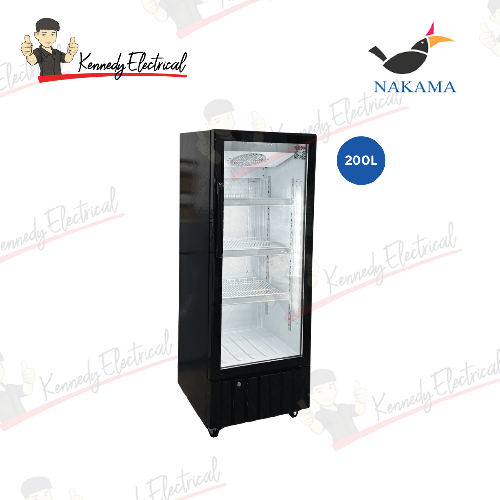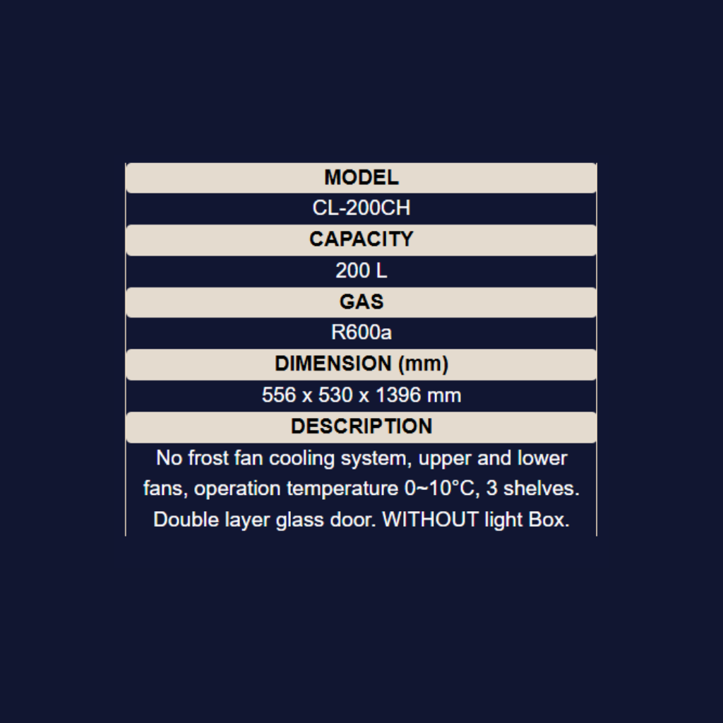 • Size: 556mm x 530mm x 1396mm • Features: Mechanical thermostat, No frost fan cooling system (0-10°C), Double layer glass door, 3 shelves • Capacity: 200L • Color: Black • Warranty: 1 Year General Warranty + 5 Years Compressor Warranty