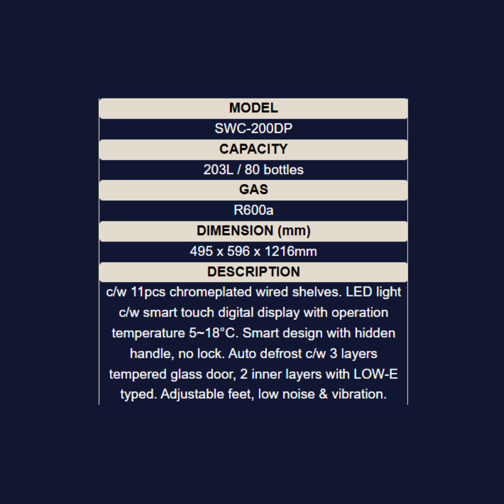 • Features: Wine Chiller, Digital thermostat, Fan cooling system (5~18°C), 3 layers tempered glass door with low-E coating, 11 Shelves