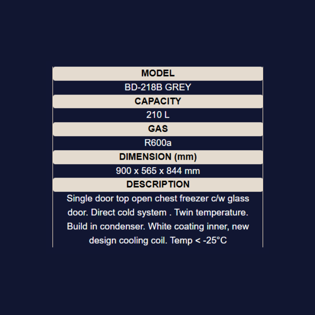 • Size: 900mm x 565mm x 844mm • Features: Twin temperature (chiller & freezer), Direct cold system (Temp < -25°C), White inner coating, Mechanical thermostat • Capacity: 210L • Color: Grey • Warranty: 1 Year General Warranty + 5 Years Compressor Warranty