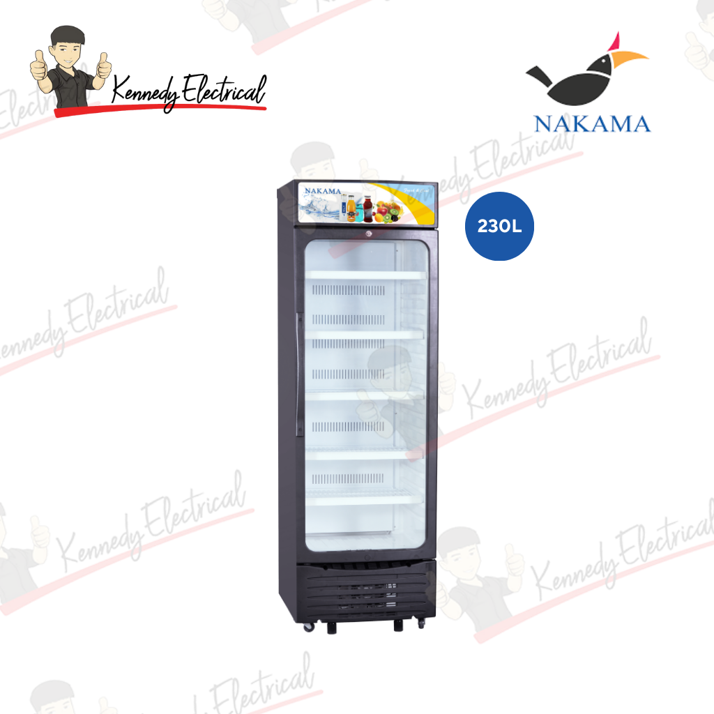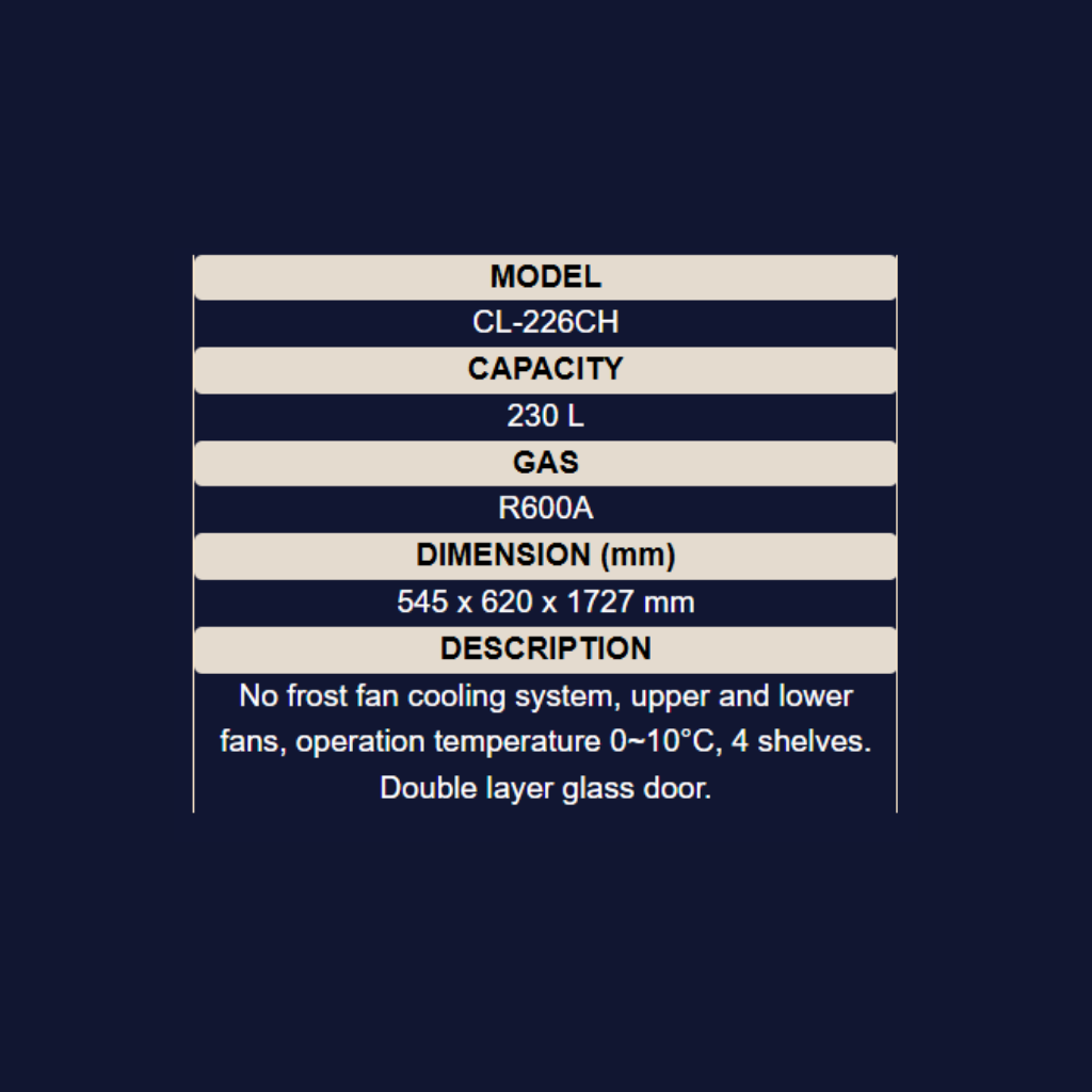 • Size: 545mm x 620mm x 1727mm • Features: Mechanical thermostat, No frost fan cooling system (0-10°C), Double layer glass door, 4 shelves • Capacity: 230L • Color: Black • Warranty: 1 Year General Warranty + 5 Years Compressor Warranty