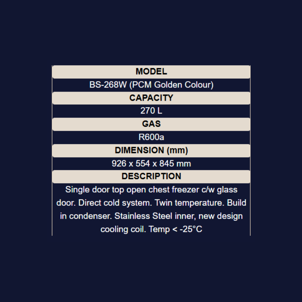 • Size: Approx. 1045mm x 605mm x 844mm • Features: Twin temperature (chiller & freezer), Direct cold system, White inner coating, Mechanical thermostat • Capacity: ~268L • Color: White • Warranty: 1 Year General Warranty + 5 Years Compressor Warranty