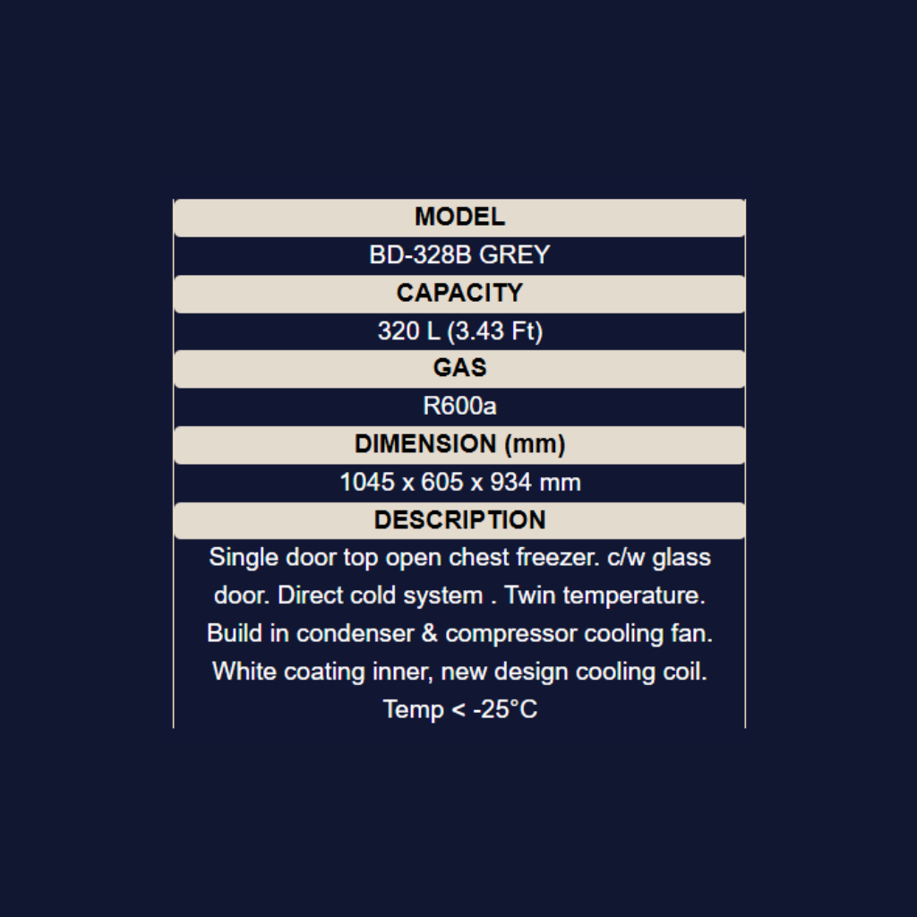 • Size: 1045mm x 605mm x 934mm • Features: Twin temperature (chiller & freezer), Direct cold system (Temp < -25°C), White inner coating, Mechanical thermostat • Capacity: 320L • Color: Grey • Warranty: 1 Year General Warranty + 5 Years Compressor Warranty