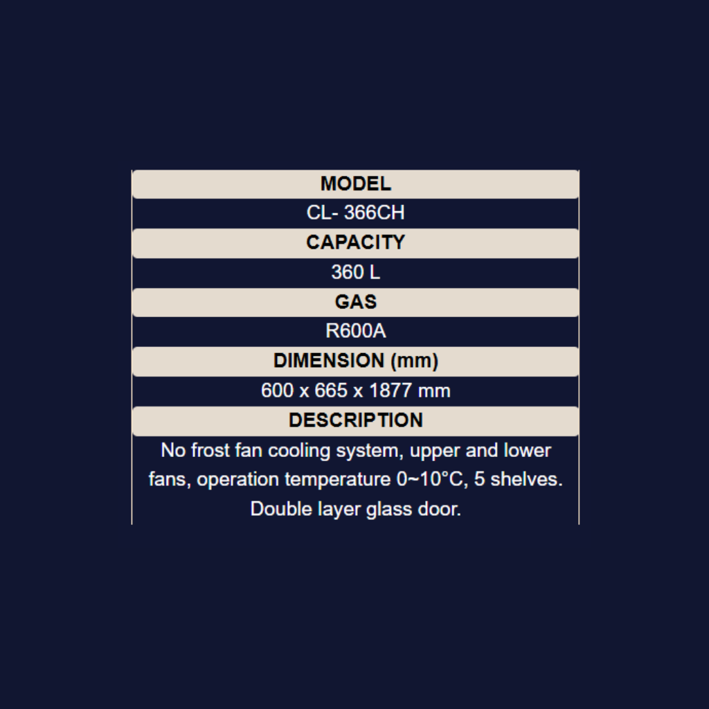 • Size: 600mm x 665mm x 1877mm • Features: Mechanical thermostat, No frost fan cooling system (0-10°C), Double layer glass door, 5 shelves • Capacity: 360L • Color: Black • Warranty: 1 Year General Warranty + 5 Years Compressor Warranty