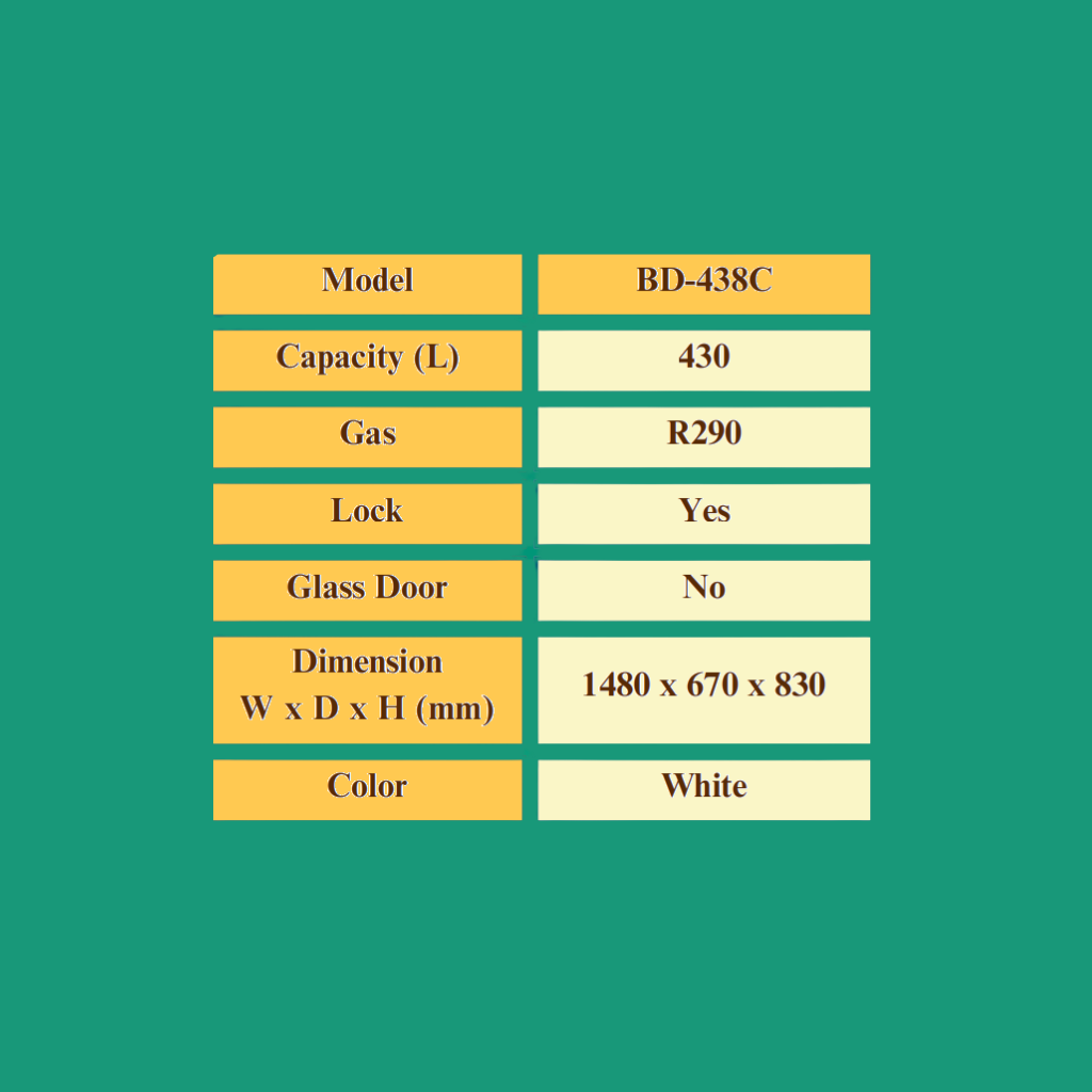 • Size: 1480mm x 670mm x 830mm • Features: Twin temperature (chiller & freezer), Direct cold system (Temp < -25°C), White inner coating, Equipped with door frame heater • Capacity: 430L • Color: White • Warranty: 1 Year General Warranty + 5 Years Compressor Warranty