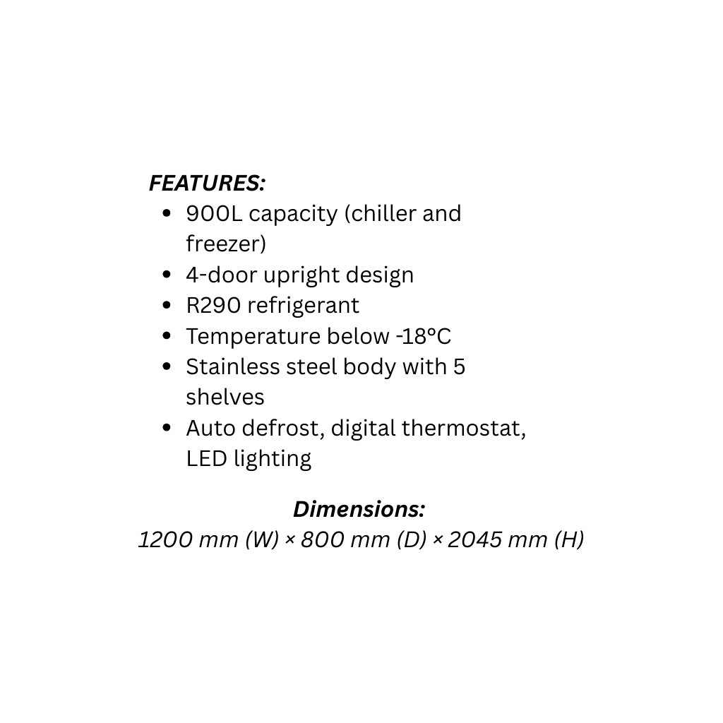 • Size: 1200mm x 800mm x 2043mm • Features: Separate digital control system (Chiller & freezer), Stainless steel inner & outer body, Self-closing door, Fan cooling system • Capacity: 900L (Combine) • Color: Stainless Steel • Warranty: 1 Year General Warranty + 5 Years Compressor Warranty